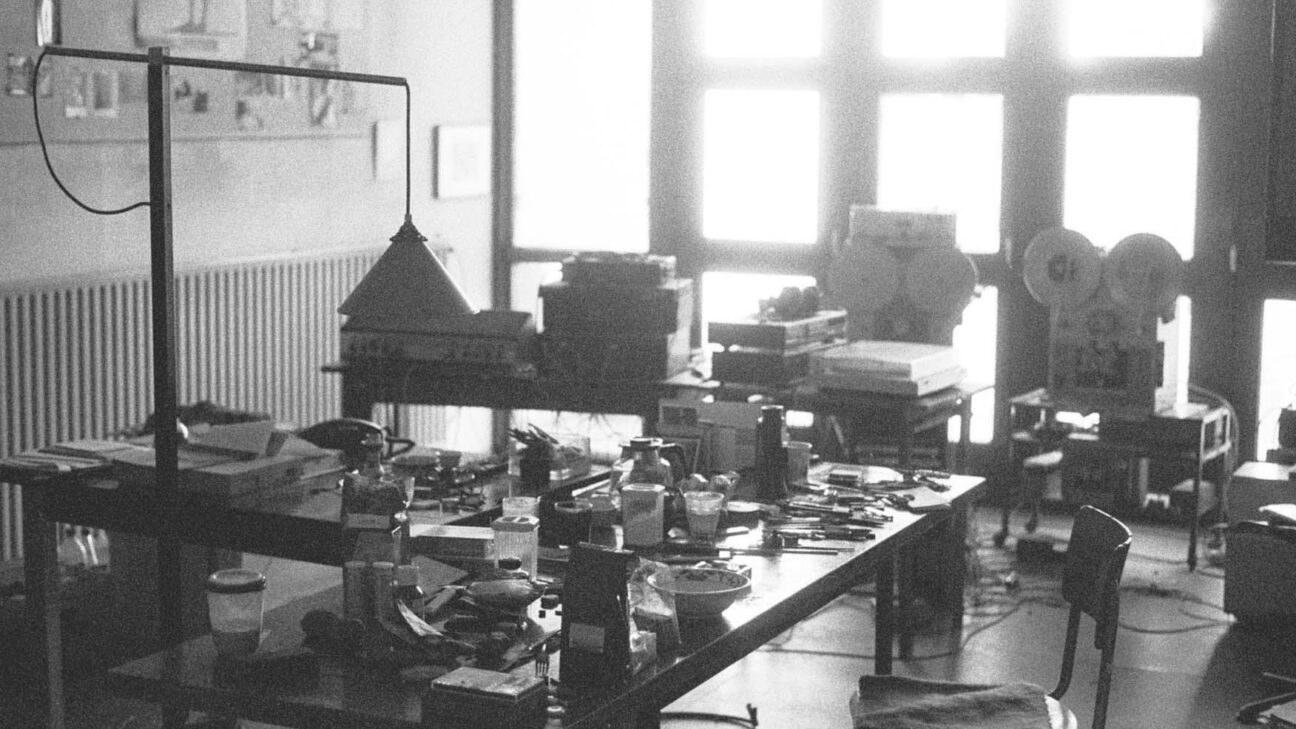 A man is shaving, a woman is doing the washing. He walks outside with the laundry in a bag over his shoulder while she is doing the dishes.