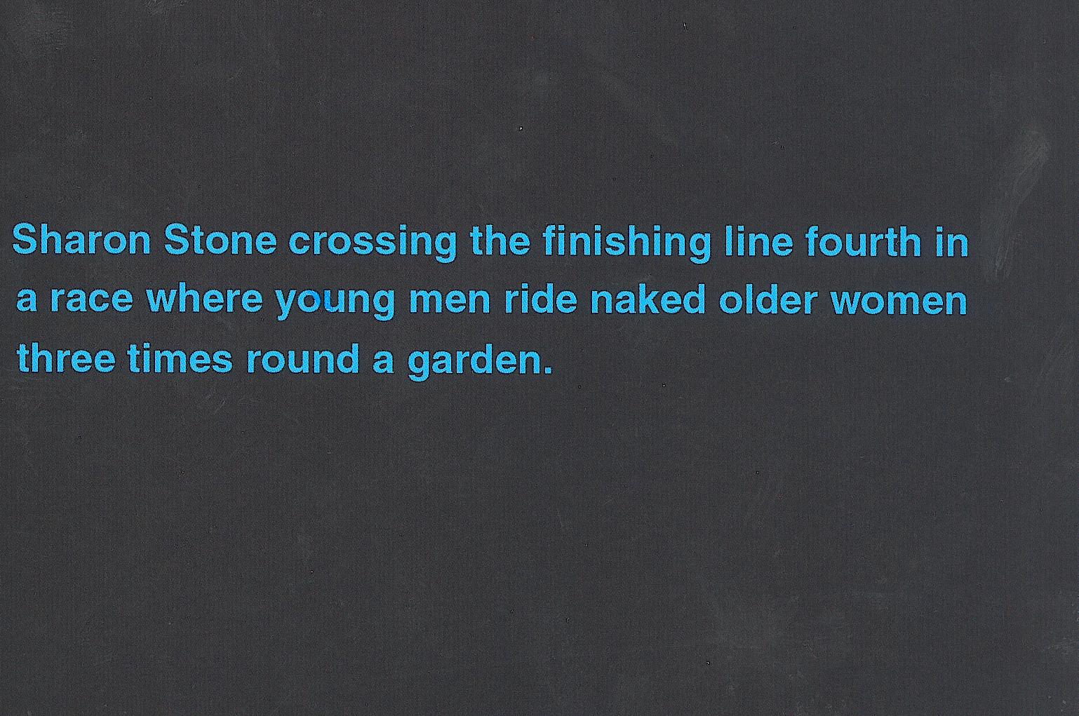 Video version of the SMS performance. Wellknown names from showbiz, especially from the Hollywood glamour scene, turn up in strange situations and unexpected combinations. As the film only shows coloured text fragments on a black background, Tim Etchells is not just testing our film loving memory, but is cheekily appealing to our secret, often perverted fantasies about public figures. For instance: Tom Cruise on the operating table.