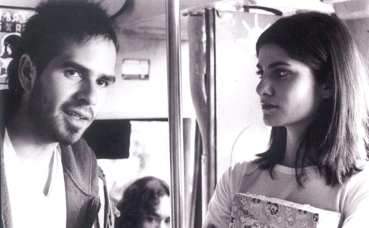 She meets him by the bus stop. She has a box of money, he is planning to rob the bus. And they both get in the same bus.