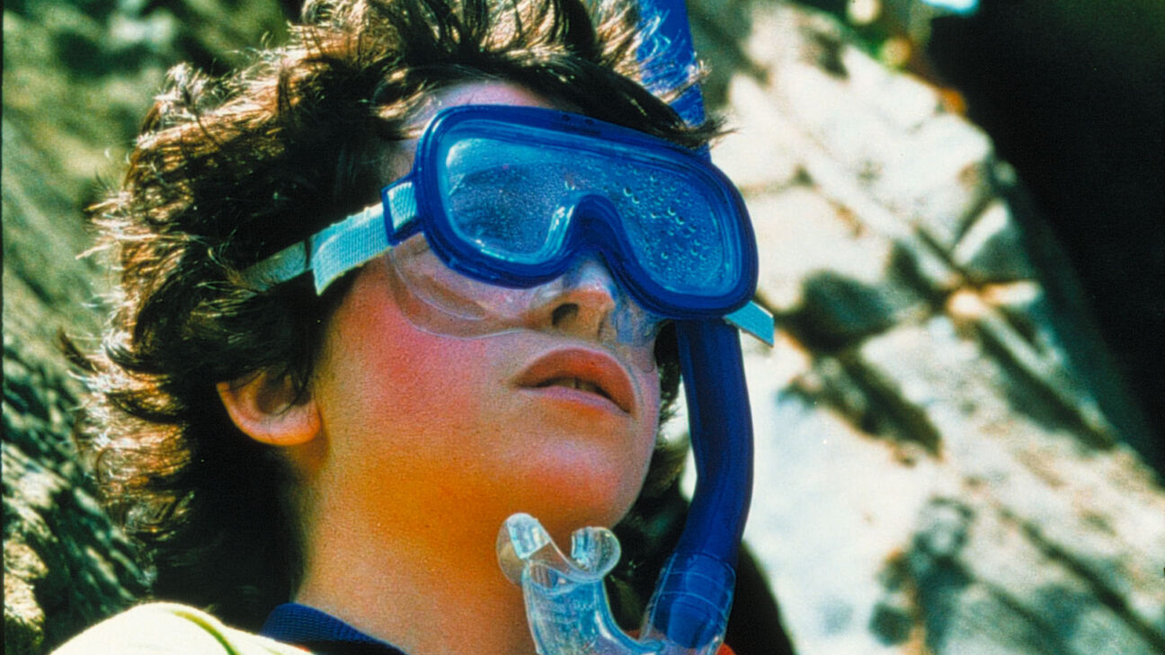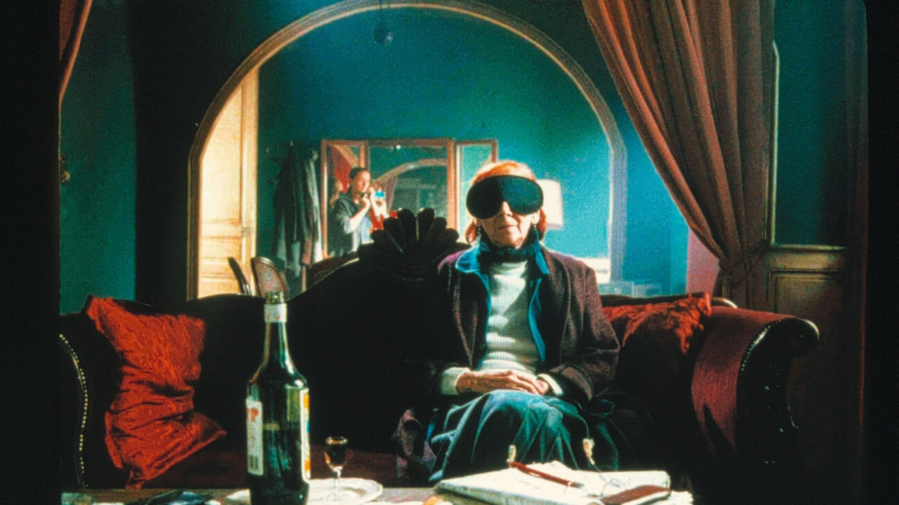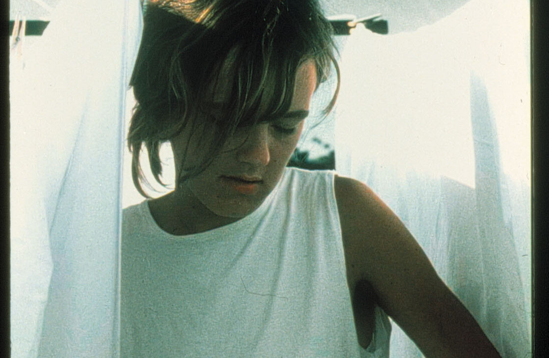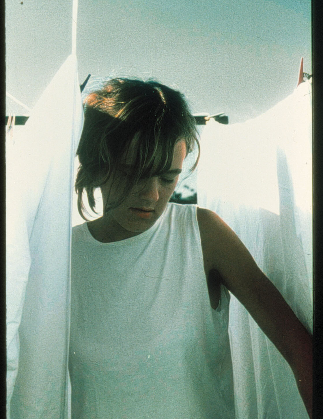 A woman gets out of the shower, gets dressed and hangs up the washing. Her husband is mowing the grass someway off.