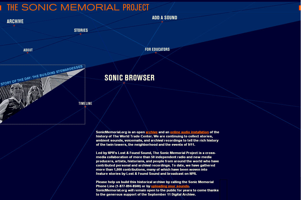 Hundreds of people contributed to this site with their recordings of the WTC before, on and after 11 September 2001. In this way, it forms a special archive of direct, personal memories that look at the historical event from almost every point of view.
