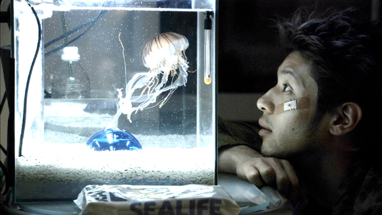 What does it take to make people change something in their future? This is one of the underlying questions in Kurosawa Kyoshi’s occasionally dreamlike Bright Future, with which he first made it into the competition at Cannes. Now renowned for his dark, alarming horror pics about bizarre events that can penetrate everyday life at any moment, in Bright Future he makes the tension more inconspicuous than in films shown previously in Rotterdam such as Cure or Pulse. Débutant Odagiri Jo, star Asano Tadanobu and Fuji Tatsuya, the protagonist from Oshima’s L’empire des sens, are stunning in their restrained roles -and in their beautiful futuristic rag clothes by Kitamura Michiko. Mamoru, a 27-year-old laundry worker, keeps a poisonous jellyfish in an aquarium with the utopian aim of allowing it to mutate into a fresh water creature. His apparently even more unbalanced colleague Yuji, who seems to have a quiet crush on him, is annoyed by the sinister suggestions of their boss. But it is Mamoru who commits the murder. After he is sentenced to death, Yuji starts to look after the jellyfish and becomes friends with Mamoru’s father, who has a shop selling secondhand techno things. Bright Future is difficult to label, but with its fascinating images and mysterious metaphors, this science-fiction melodrama shot on DV is an appeal for ‘minor revolutions’, and above all: visionary cinema.