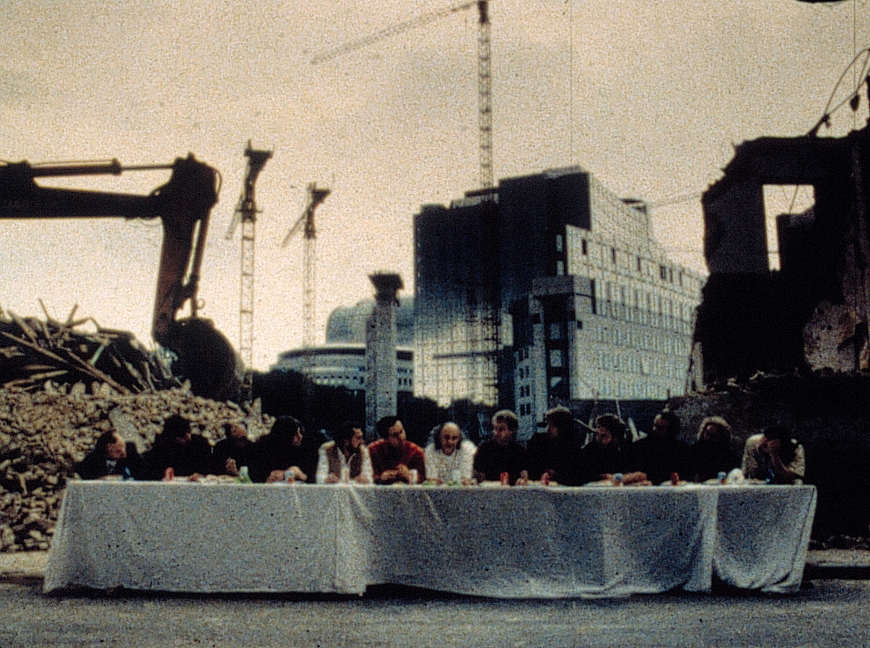 A farewell for ever. A last supper. The construction of the buildings of the European Community flattened much of old Brussels. Against the background of an almost demolished set, friends (all film makers) sit down to a Last Supper. And they depict the famous setting of Leonardo da Vinci. Lehman himself plays Jesus.