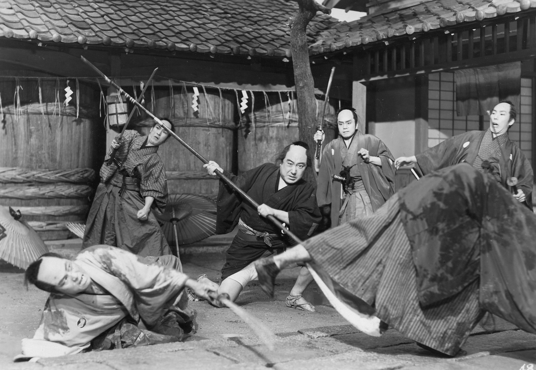 A key work of post-war Japanese cinema. As decisively as Kurosawa before him, Uchida broke the conventions of the chambara or sword fight film with his witty, loose-limbed A Bloody Spear at Mount Fuji, the first work he made after returning from eight years in Manchuria. His sojourn there, under the spell of the crazed militarist Amakasu Masahiko who ran the Manchurian Film Cooperative, suggests how easily Uchida slipped from the romantic leftist populism of his pre-war social critiques to an uneasy admiration for bushido values, for empire, emperor and warrior ‘ethics’. Bloody Spear marks Uchida’s post-war return to Japanese cinema and to progressive principles, but his homecoming is markedly ambivalent in its values. As Craig Watts has written, ‘both progressive and nostalgic, humanistic and nationalistic, peaceful and violent, A Bloody Spear at Mount Fuji, like the Japanese experience in Manchuria, is an aggressive conglomeration of extremes.’ From its shambling ‘on the road’ opening, scored with jaunty jazz and marked by a flagrantly artificial setting and welter of incident, to its Shane-like ending, the film takes in a remarkable range of characters and classes, of tones and traditions. Its narrative has a peculiar stalling quality, as though Uchida were determined to suspend the expectations of the samurai film by deferring the violence forever. Full of subplots and spin-offs, scatology, sentimentality, and social satire, this simple tale, about a samurai delivering a tea cup to Edo, becomes a sprawling, digressive epic whose culmination – a fight to the death amongst gushing sake barrels – shocked the Japanese audiences of its time with its sheer vehemence. (JQ)
