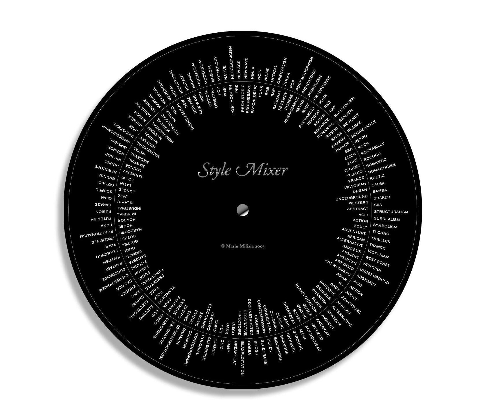 Minimal Louis XIV? Medieval Hip-Hop? In Ocean of Sound, David Toop writes that contemporary music, both popular and intellectual, is the result of continuous hybrids of musical genres and sub-genres between themselves. The creation process doesn’t happen in the void. The surrounding environment, a mix of past and present, influences architects, composers and artists. ‘Baroque’n Roll’ was the title of an article about the French band Air in Time Magazine. Sony has commissioned research on the possibility of organising the musical genres and sub-genres that appear on its catalogue: ‘a taxonomy of musical genres’.
