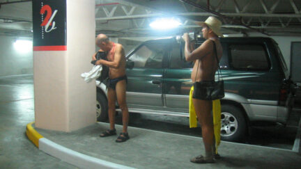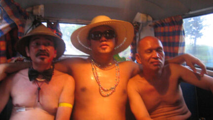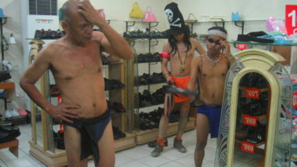 It looks like a joke that has got out of hand, a kind of contest: who dares walk the street wearing only a G-string? G-string Kings is indeed a cheerful and cheeky film, in the spirit of the other work by this most cheerful, cheekiest and certainly most productive of Filipino film makers, but it is not just a silly joke. Seven sturdy mature men dressed in no more than the bahag, the traditional string with loincloth as worn by the original inhabitants of the Philippines. It couldn’t be more Filipino, so why should Filipinos get upset about it? Yet the cheerful procession is regarded as a provocation of good taste and even of good order. The film is a feature, made in the idiom of the silent film, but shot spontaneously on the street, like a documentary. The men go out into the world as kings: King Black, King Red, King Blue, King Yellow, King Green, King Purple and King Orange – seven rainbow kings (bahag-hari) with their ethnic G-string (bahag). They travel in a jolting van from the natural forests to the urban jungle. The Bahag Kings, descendants of noble rulers but also of village idiots, search all over for wala (nothing). In the end, they, along with the film maker, are arrested by the police. What was once traditional costume turns out to have become obscene. (GjZ)