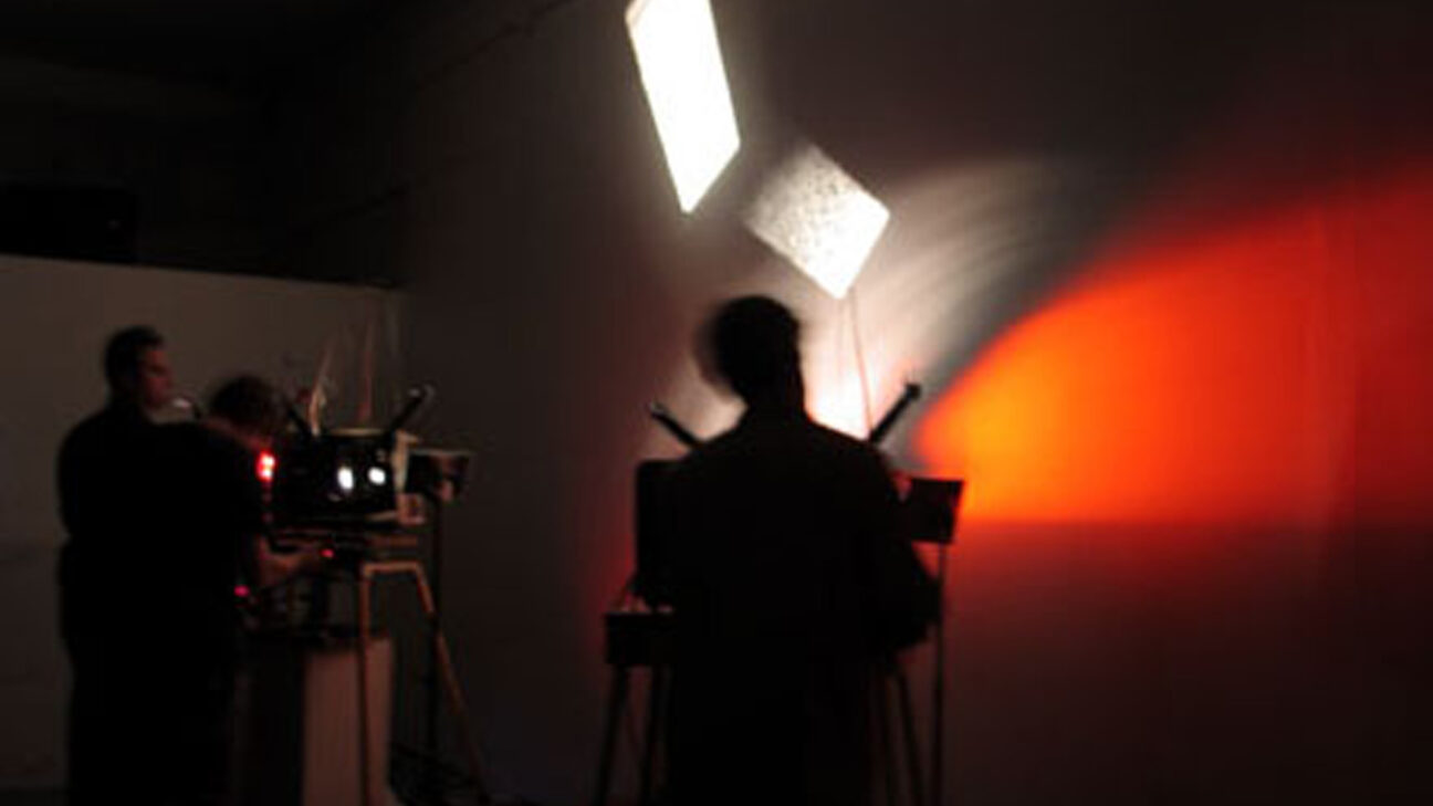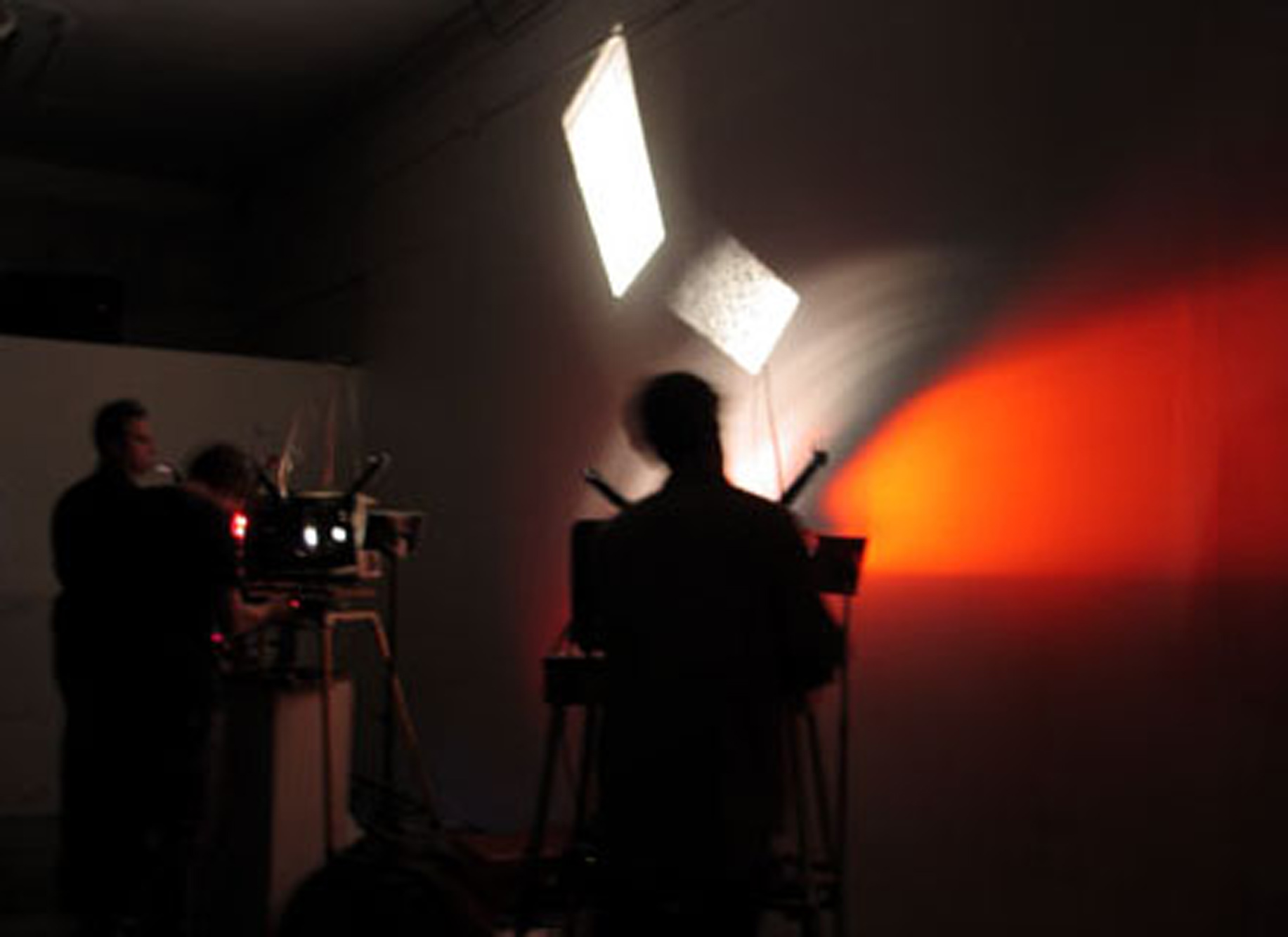Wet Gate is a projector ensemble from the San Francisco Bay Area, made up of Peter Conheim (also known from the bands Mono Pause and Negativland), Steve Dye (Epic and Santo Subito) and Owen O’Toole. For their performances, they use 16mm projectors, loops and simple electronic processes. The film material, that is made up of found footage, their own shots and loops with abstract images (treated by hand on the film material), is fanned onto the screen using mirrors they made themselves.
