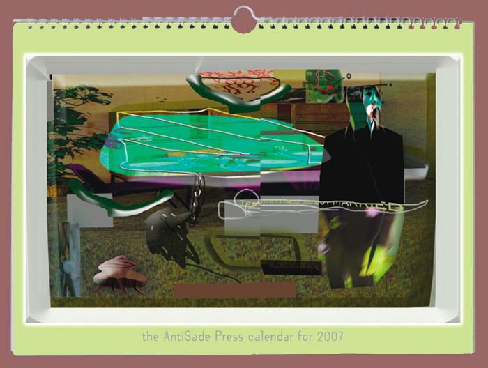 A non-stop digital vortex. Visual artist Annemie van Kerkhoven intercuts The AntiSade Press Calendar for 2007 with notes and snapshots and other kinds of mental annotations from Berlin.This calendar is the first edition of The AntiSade Press. AntiSade plays an essential role in the re-enlightenment of each new beauty theory/strategy/therapy. AntiSade is the mirror picture of everyday progressive art. It doesn’t occur in the art world as such, but under extreme circumstances it can be created. The images are the hard copy of one year of the artist’s life. The soundtrack is provided by the industrial-experimental-psychedelic band Bum Collar, with artist Dany Devos, musician Mauro Pawlowski and writer Pol Mennes.