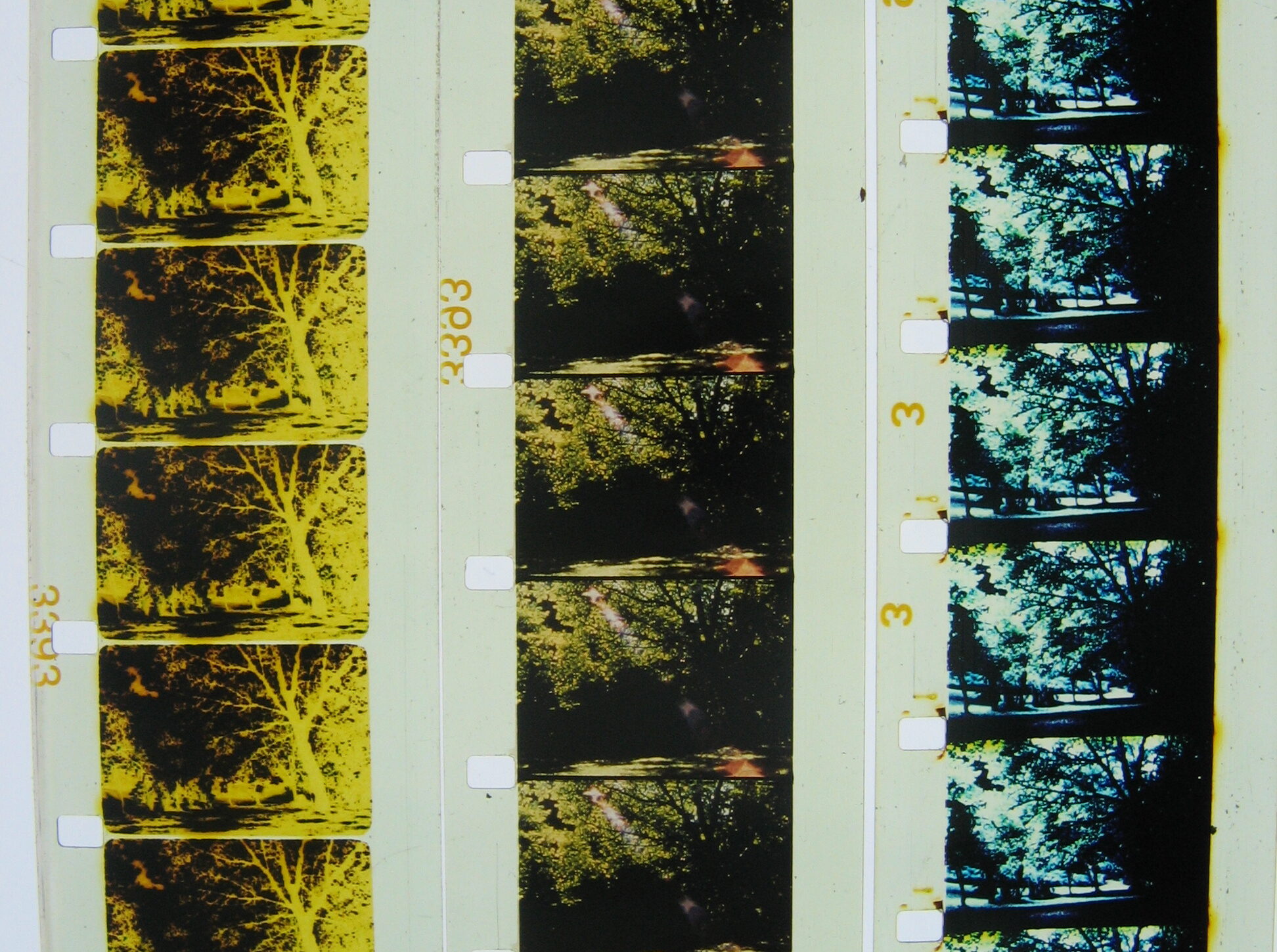 Free improvisation for four film projectors. Transformation of a masterful landscape painting into an overwhelming nocturnal forest walk. A subtle game is played with use of various film emulsions in different colours. The same shots of a deserted orchard are processed repeatedly by the makers themselves in their own laboratory and are projected over the top of each other in the performance. The image that results reveals a continual slow change in that one scene.