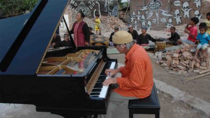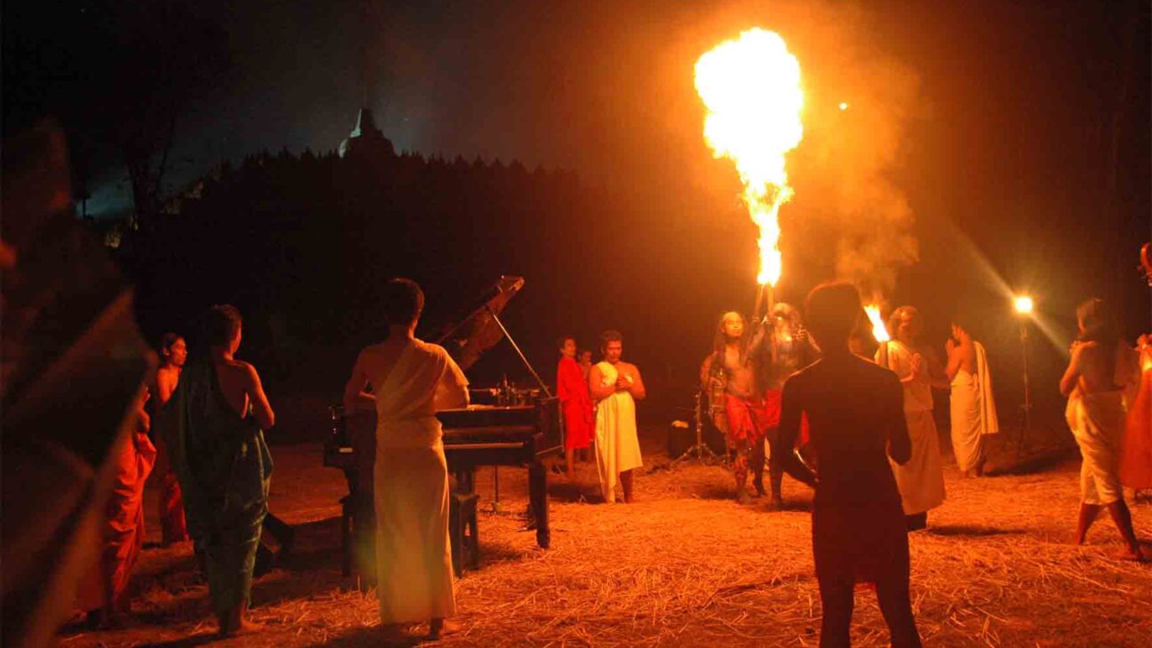 You cannot call this film a music documentary. All the works in Teak Leaves at the Temple were specially performed for the film. Two extremes in music were brought together: western free jazz, leaning entirely on improvisation, and the local traditional music of Java as it has been played for centuries around the Borobudur Temple. The various musicians with their varied musical approaches performed together on this occasion. A unique event. A free-jazz trio, made up of Heinz Geisser (percussion), Guerino Mazzola (piano) and Norris Jones (bass), enter into a dual, as it were, with music from the area. It’s a very imposing area, because the performances and shooting are all literally in and around the Borobudur itself. The film is made up of three parts with a commentary by a local sculptor in the guise of Superman. First it looks at everyday life, then the major tragedies in life, such as the earthquake at Yogyakarta near the temple and finally the more spiritual element of life is tackled. The film could well be regarded as a a more playful and freer sequel to Nugroho’s grand Opera Jawa, in which many sorts of music and theatre were mixed as well. In Opera Jawa, the narrative drama finally takes over the core, while in this film the theatrical and musical performance is able to lead a life of its own. (GjZ)