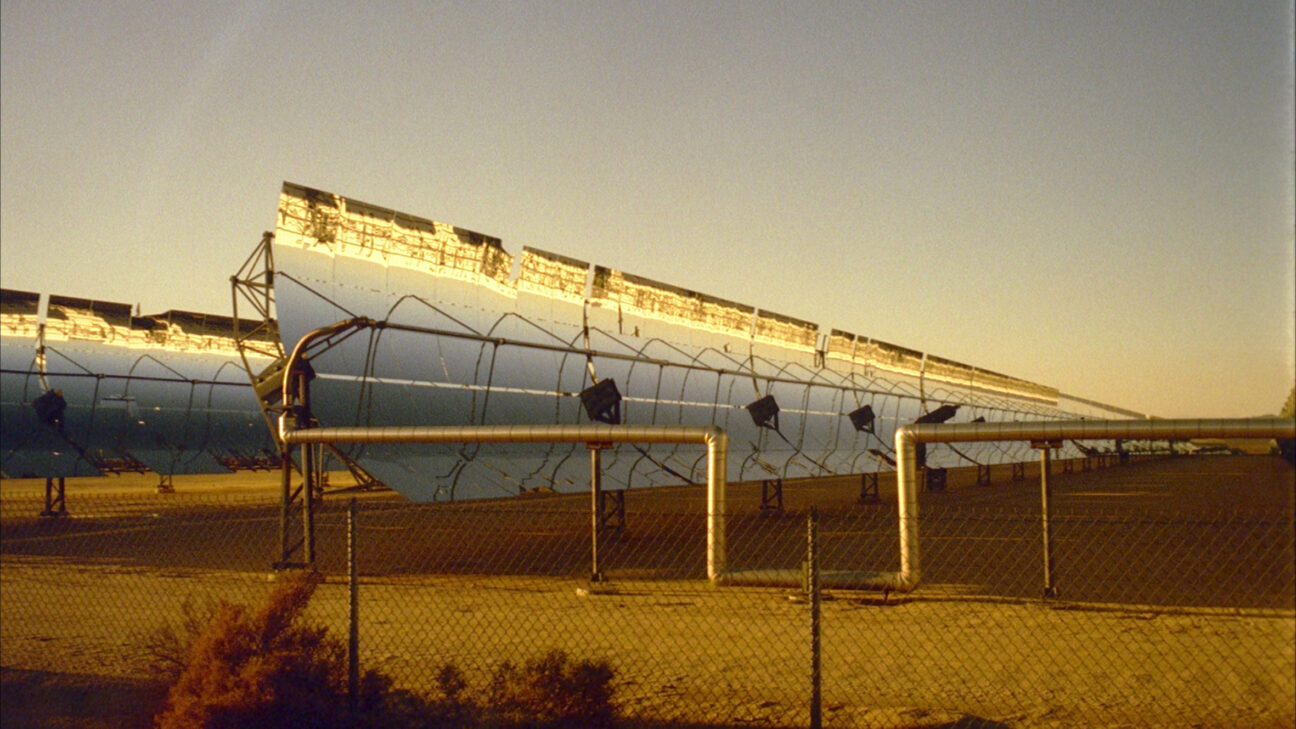 The Mojave desert. Endless rows of solar mirrors slowly revolve, reflecting their surroundings. A voice recounts local stories. -