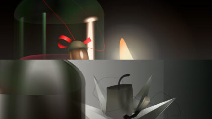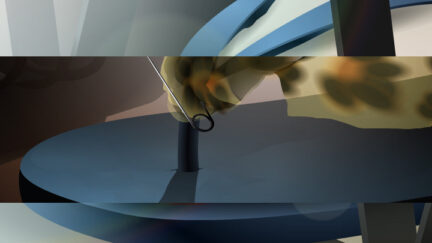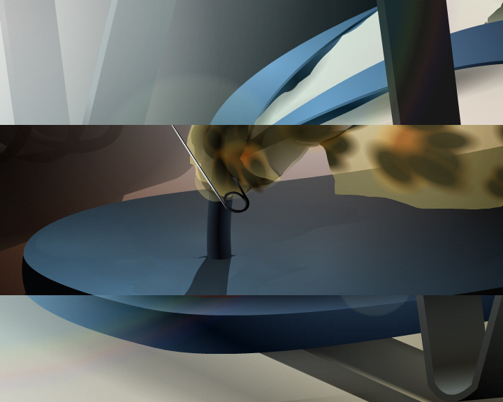 Parallel universes… banal household objects and everyday scenes are rendered alien: bizarrely colourful and abstract, looking like moving 80s airbrush art. The worlds flux in and out of phase via shifting animated planes, revealing the full story.