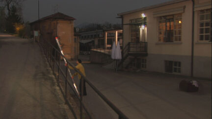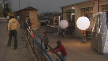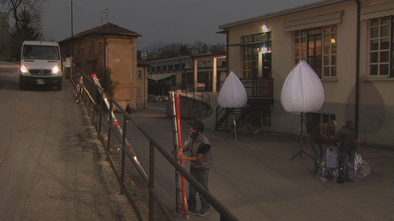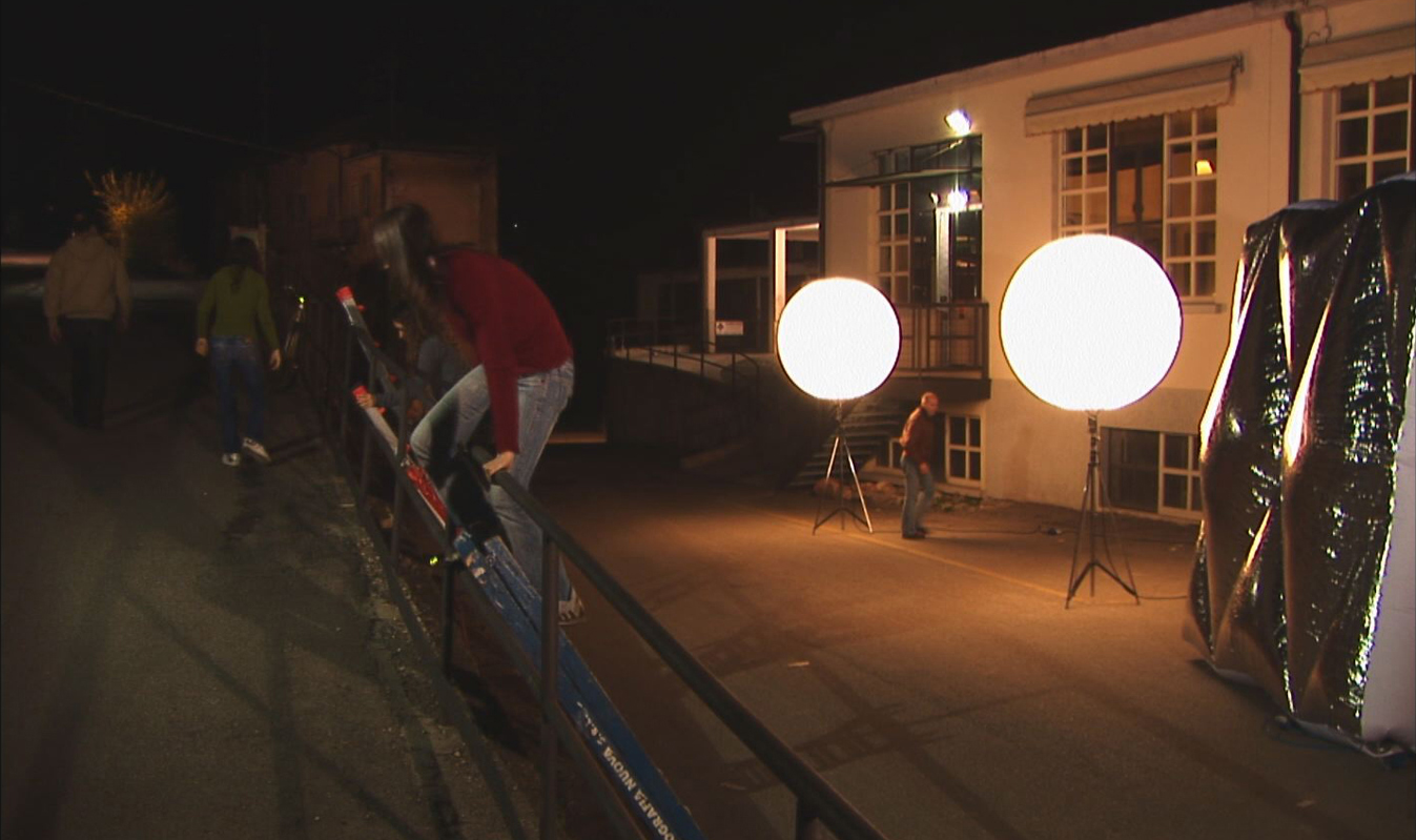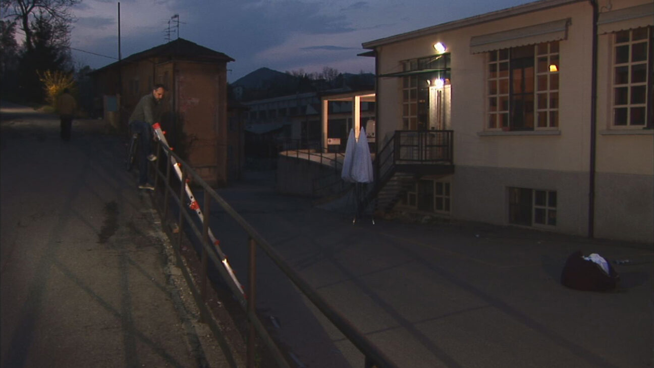 At a single location, twelve figures walk four identical routes, each trying to follow the movements of the person in front of them. The repetition turns them into somnambulists, as it were, in a world that seems to be outside the bounds of time.