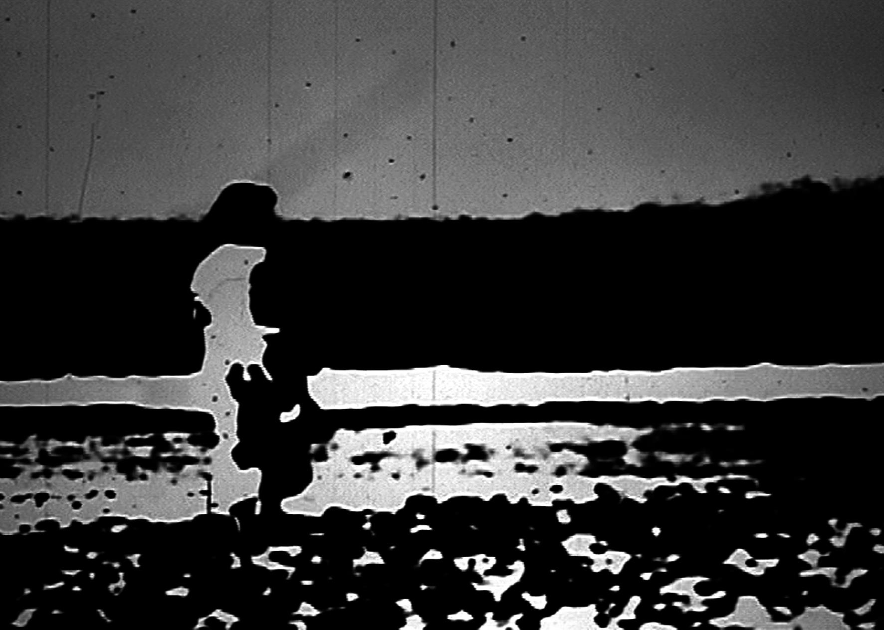 H(i)J is a hand-processed film that is extremely rich in contrast. More than with standard black-and-white material, the black and white here seem to lead their own lives, conquering the entire film frame in turns. A visualisation of solitary silence, a figure at sea, change and conception.