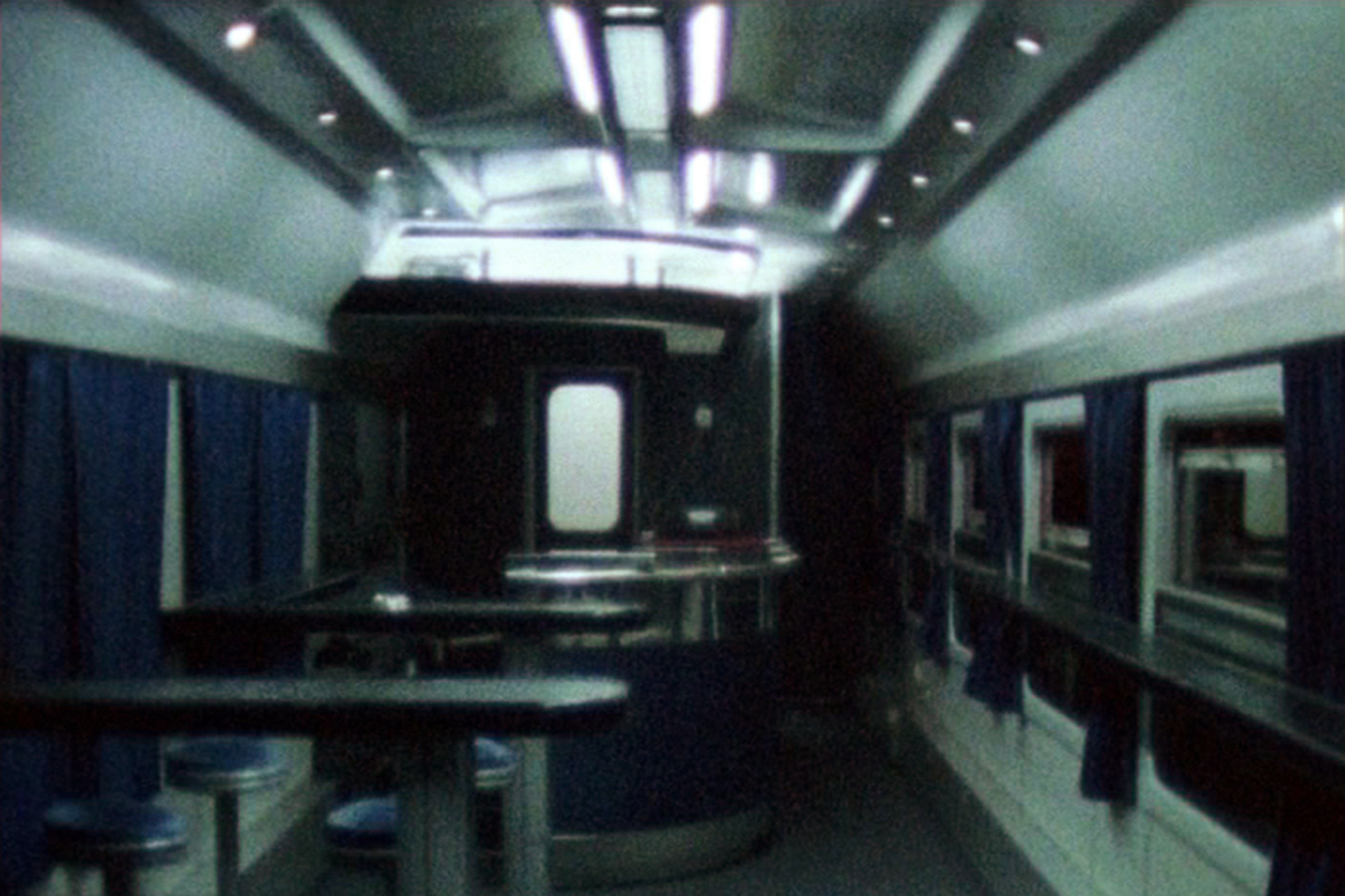 Olthaar’s recent films and models show specifically designed spaces. Dining Cars was shot on Super-8 in trains from the 1960s and 70s. Having dinner here must have been very cosy once, but today the rolling interiors have become rocking time capsules.