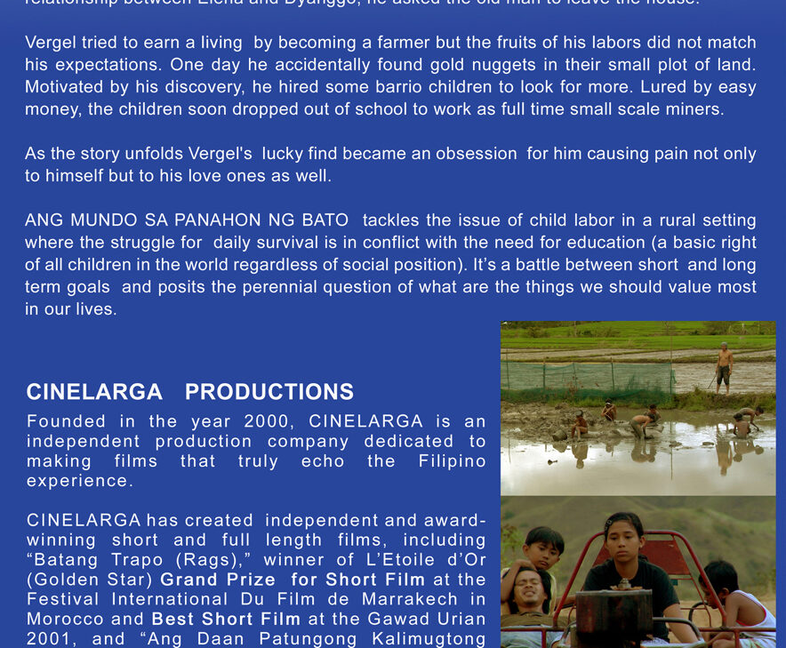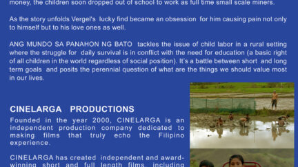 On the day when Vergel returns from the mines, turmoil comes to the lives of his little brothers and his sister. They were doing very well thank you, living quietly without parents in the beautiful countryside of the Philippines, which with its sloping hills and rice paddies seemed to have an abundance of agricultural wealth. The feverish and desperate quest for raw materials interferes with the freedom and education of the young children in the countryside. Vergel’s sense of honour and concern for his naughty little brother and infatuated big sister turns into intolerant greed when he finds gold on his land. Will things work out in the end? Ramon de Guzman’s (1971) Stone is the Earth forms part of his ‘Earth’ trilogy. The film was supported by the Hubert Bals Fund.