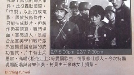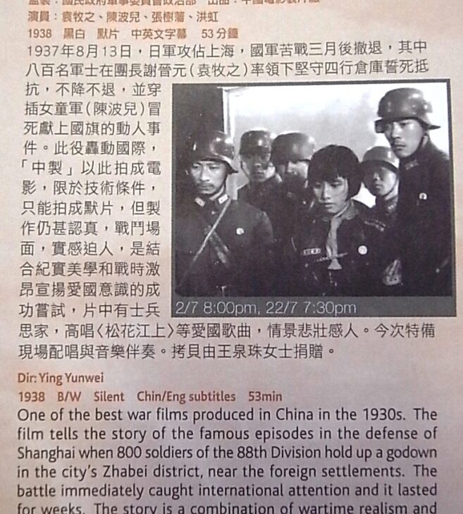 Re-imagination of a famous (bordering on legendary) episode from the battle of Shanghai: 800 soldiers of the 88th regiment against what feels like the whole of Japan’s Imperial Army – think Thermopylae, Chinese version. A splendid, visually amazing gem which, in its own way, is also a last stand: of silent cinema, Shanghai style.
