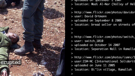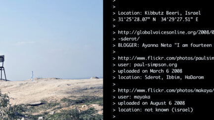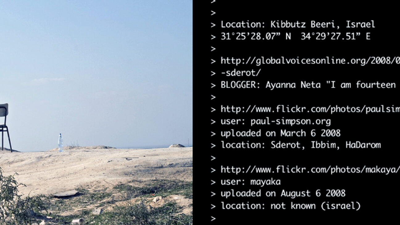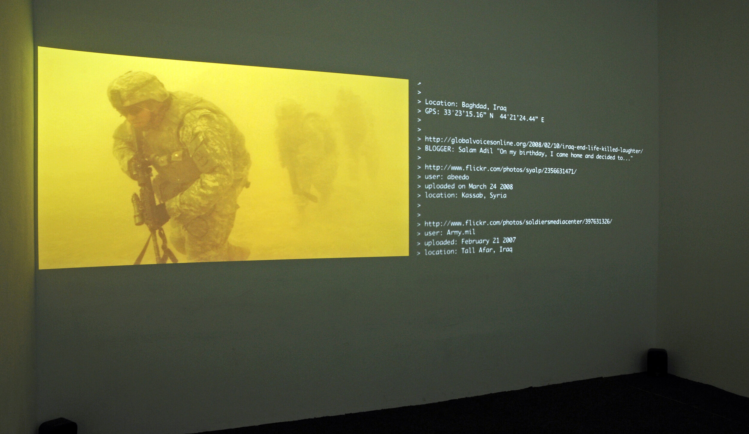 Photographs and videos from various war zones found on Flickr are brought to life by reports from bloggers and strung together by Google Earth. Parallel to this dramatic report, the origins of these images, blog excerpts and GPS locations are shown as a plain text file. Artist duo Thomson & Craighead critically examine the mediated information surrounding us and, quite rightly, call the results a film.
