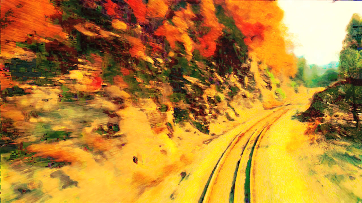 A train is heading to the vanishing skyline; in perpetual colour metamorphosis, the landscape never ceases to stay still. -