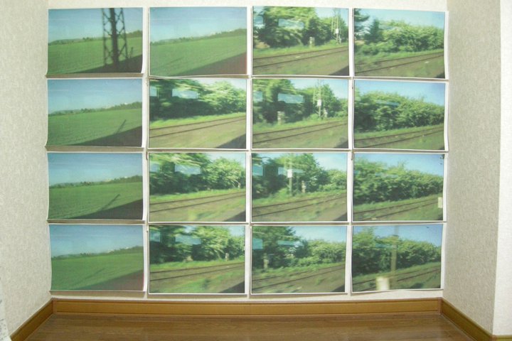 Semi-surround landscape projected on 16 screens, showing rhythmically-edited moving images of the passing landscape framed though a train window. -