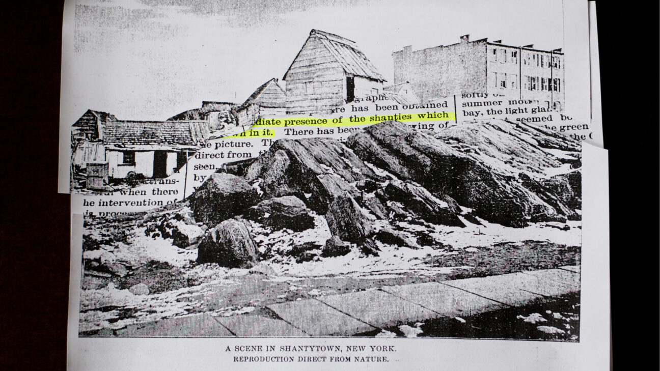 Through a Fine Screen starts with a grainy image from 1880 of an American shantytown and is viewed as the first undoctored news photograph to be published. The origin and location of the photograph are however obscure. A reflection on media archaeology and historical falsification.