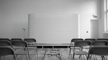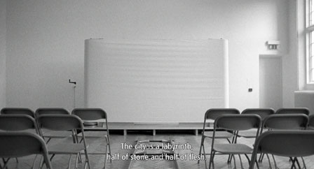 Travelogue points at two historically popular forms of travel entertainment: the moving panorama and the travelogue film. A meditation between space and time, it highlights the gap between idea and experience and the difficulties inherent in creating representations of a place.