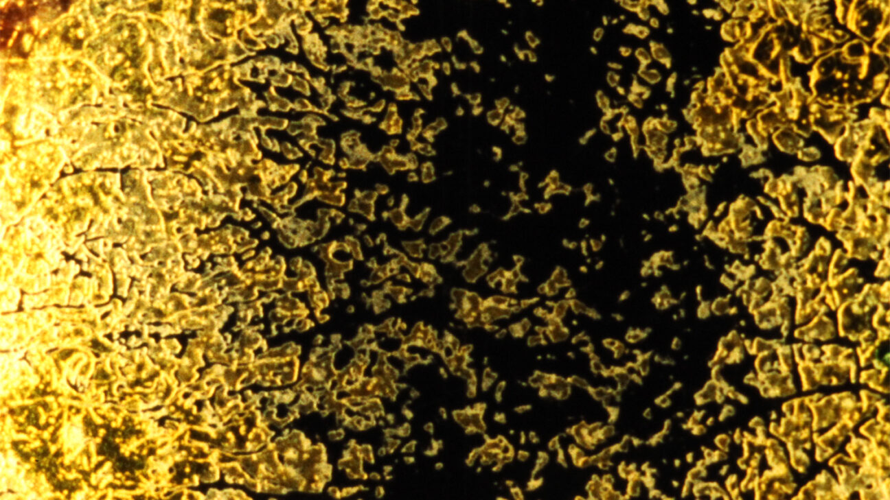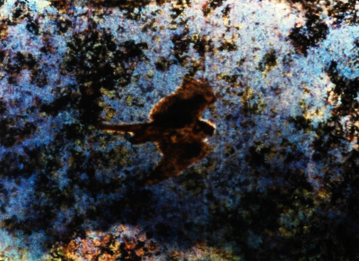 This ultimate film-recycling project about the end of 16mm is made up of material left over from Reeves’ earlier work When It Was Blue; first buried for several months in a rubbish tip where the enzymes and moulds provided beautiful patterns. Then Reeves meticulously painted the 16mm film material again by hand.