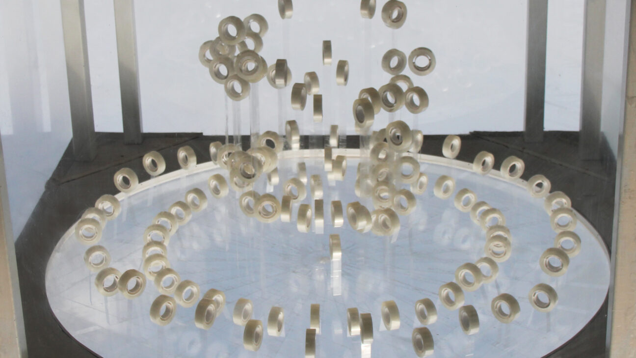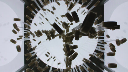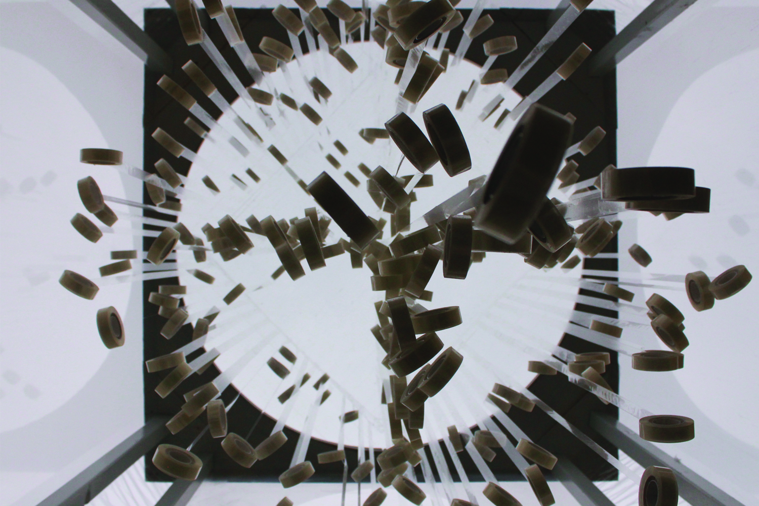 Countless rolls of tape go through a process of development and degeneration. In the extremely slow-paced life of these objects, everything starts out the same. But deviations and differences slowly become visible through the force of gravity, resulting in unpredictable shapes and movements that somehow feel familiar. (JR)