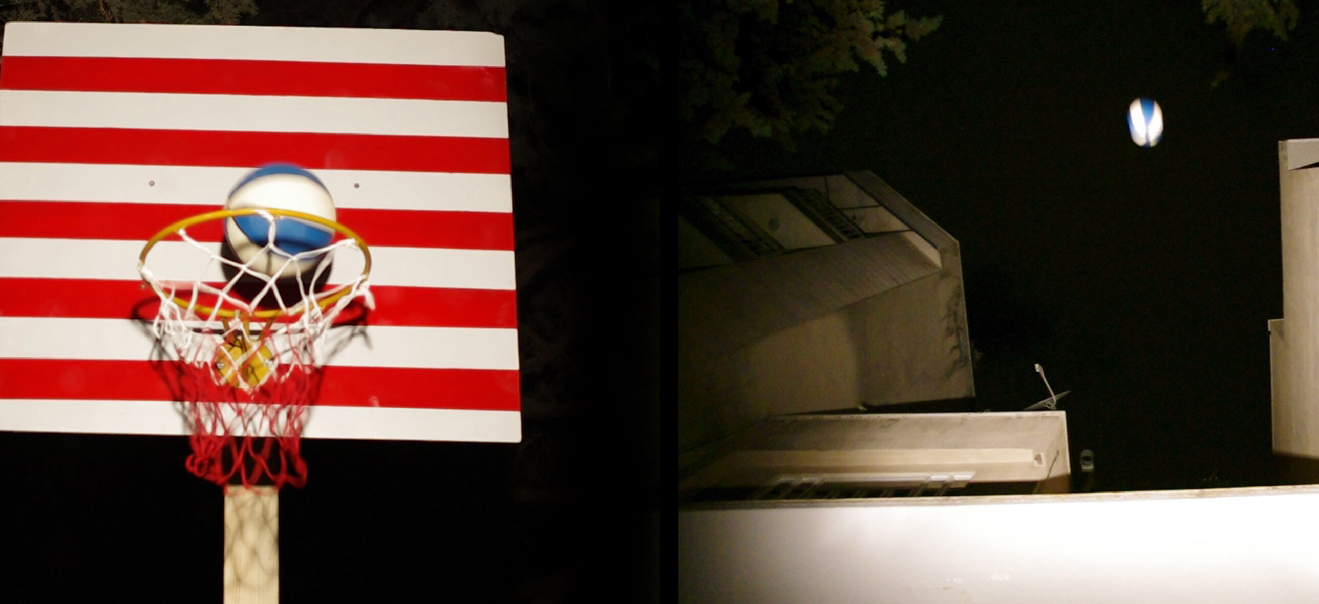 A single-channel video split into two frames about the American dream. One frame shows a wooden board with a basketball net, with white and red lines in the background. The other is a low-angle shot of a building and a white sky, in which blue and white balls fall like shooting stars. The two frames portray an illusion of how the ball scores a goal and the dream of going to heaven comes true.
