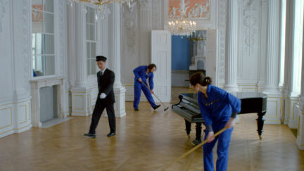 Three young Georgians have to clean a castle in Berlin, where a German arms manufacturer’s art collection is being set up for an exhibition. Of course, the proletariat isn’t welcome at the opening party and they are banished to a servants’ room in the attic. Downstairs, however, a splendid buffet attracts them – so why not just ignore the unfair prohibition and cross the line of class society? Didn’t the French Revolution start over a piece of cake? Telling each other unlikely tales ranging from an adventure of Saint Francis to a spiritualistic séance in the USSR, the three try to figure out whether class relations can be overcome, when all existing stories say they can’t. They also have to deal with obstinate clouds, neo-liberal working conditions, apocalyptic petty bourgeois and agents of a late-capitalist conspiracy, which they defeat with a laziness one must call messianic. A proletarian winter’s tale, in short. Screens twice together with Redemption.