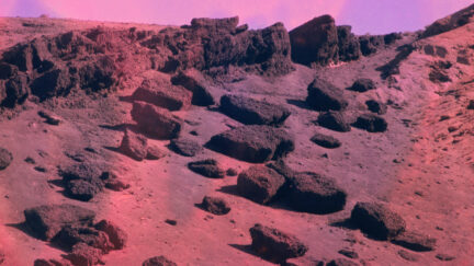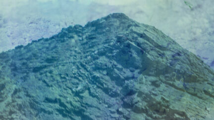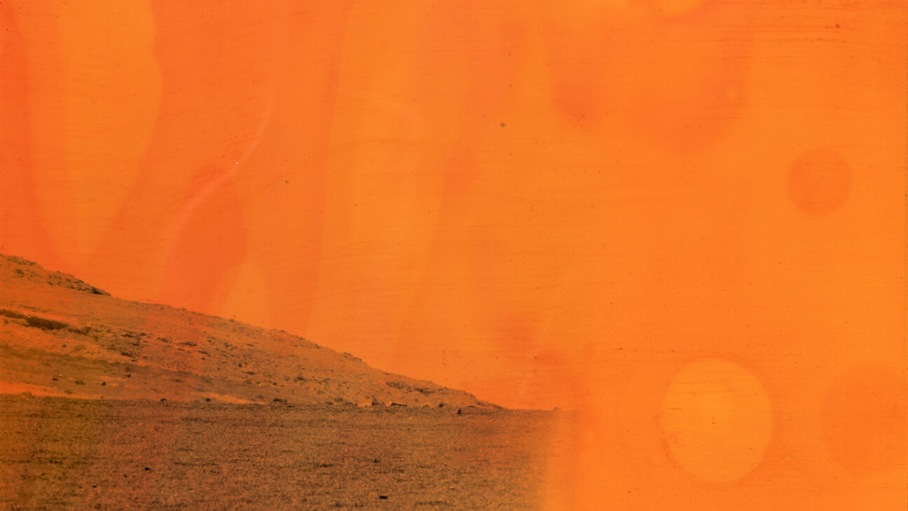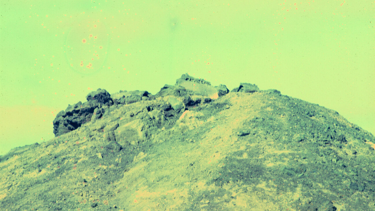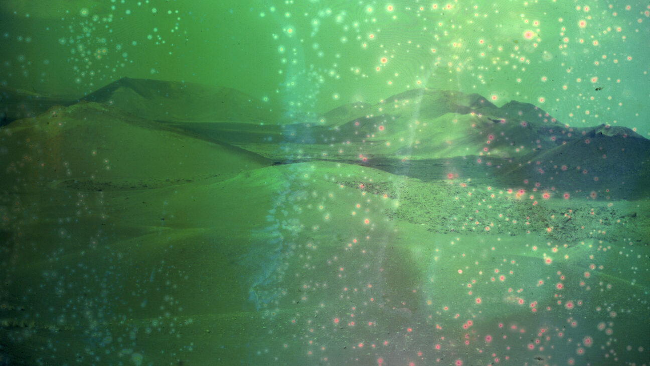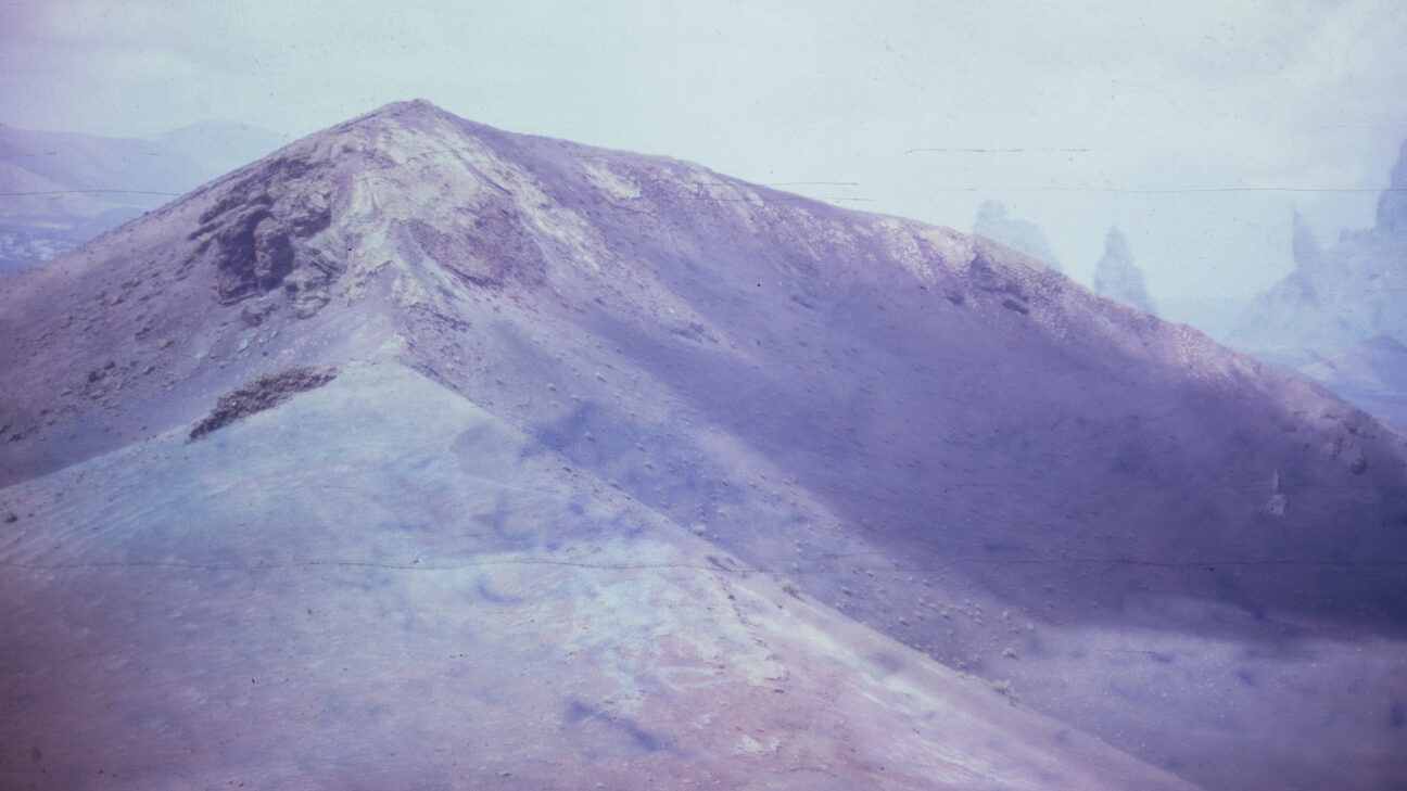Shot in the volcanic landscape of the Spanish island of Lanzarote, the slide projection appears to show a future that recalls the beginning of the Earth. By exposing film stock to household chemicals, details fade and colours emerge to foretell the end of history.