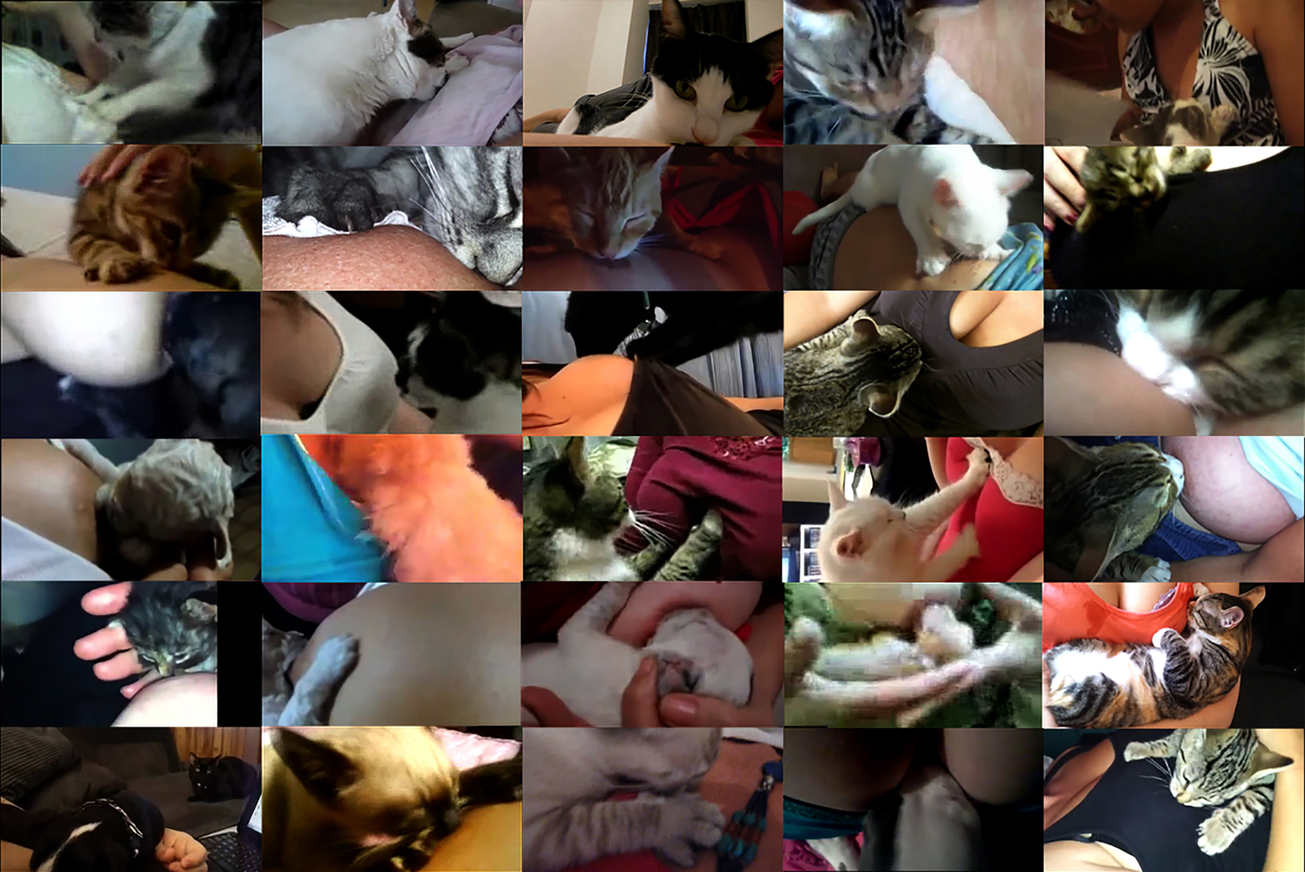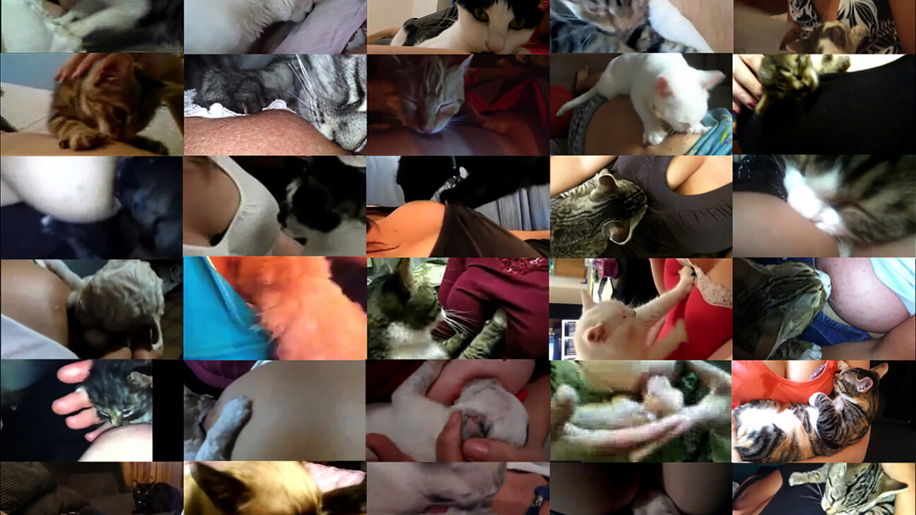 Overly cutesy collage of YouTube videos in which women overenthusiastically introduce their pets to the world. They all openly declare their love of their pedigree dogs and cats. The relationship between people and animals in current society is a recurring theme in the work of women’s art collective Neozoon.