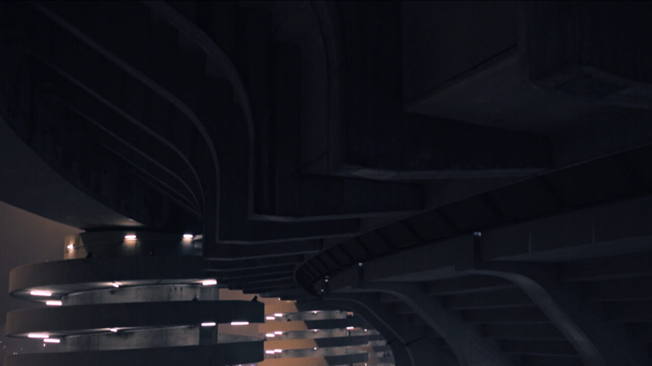Night-time, high-tech surveillance video uses circling camera and hallucinatory soundtrack to depict an average business park. Things are not what the -