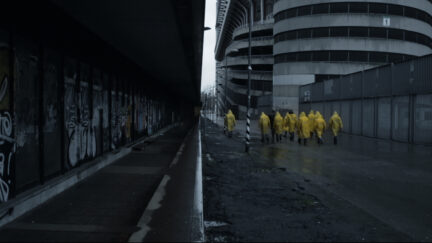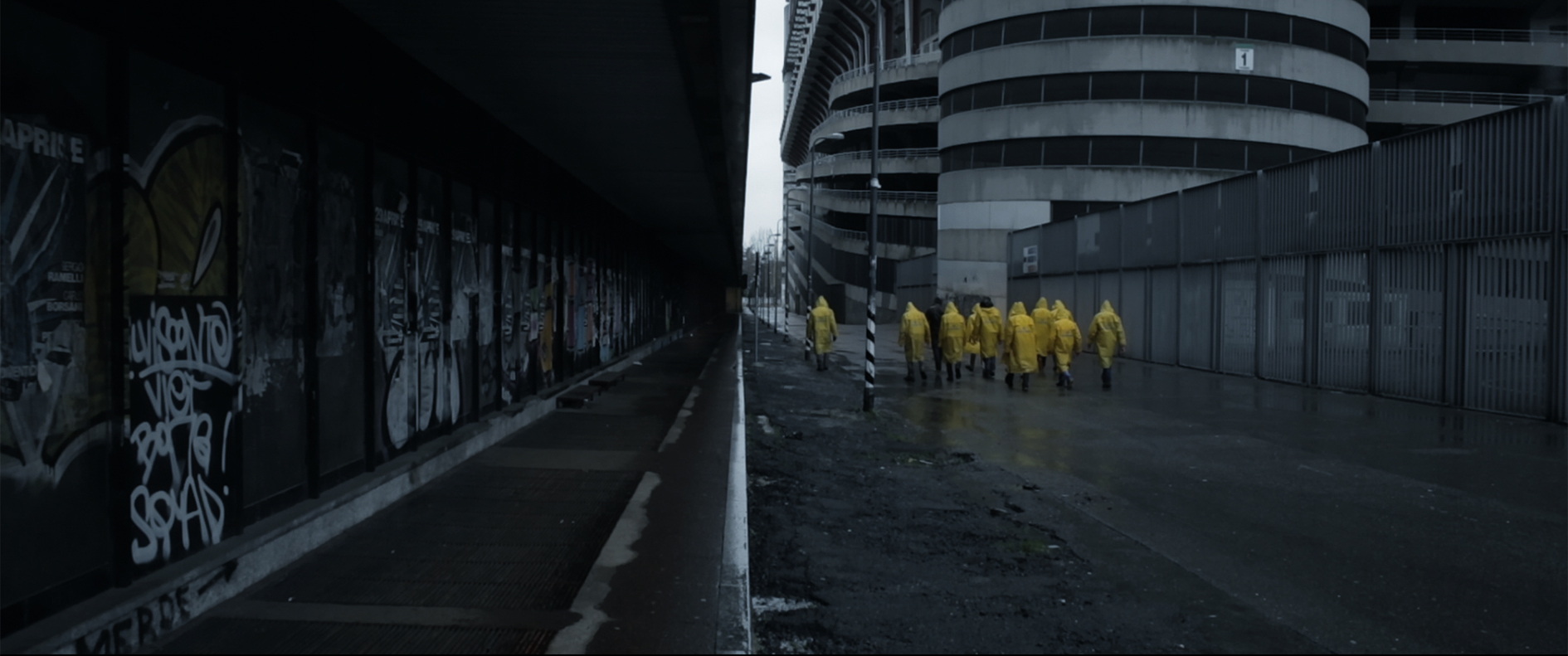 Cameras record the silent workers’ military precision as they prepare Milan’s famous football stadium on match day. Exceptionally detailed architectural or even anatomical portrait of a classical arena. What is at stake here must be of great importance.