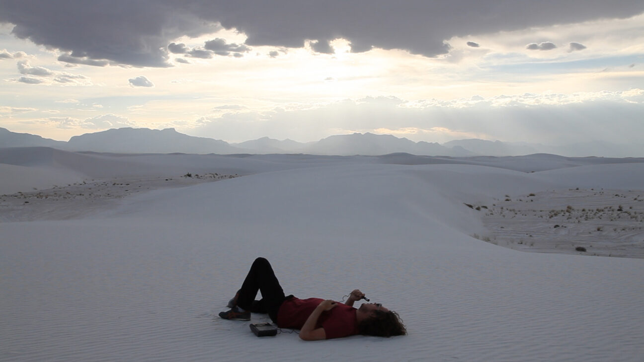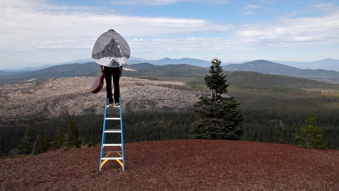 A man, a Dictaphone, the desert. Then standing on a stepladder in a landscape, a cut-out of a mountain on his back, strumming his guitar. The thing itself and its representation provide the ingredients for a game with cultural references. How do you get a grip on the point in time when actual experience and premeditation meet? And how does that relate to our sound and image-based sense of reality?