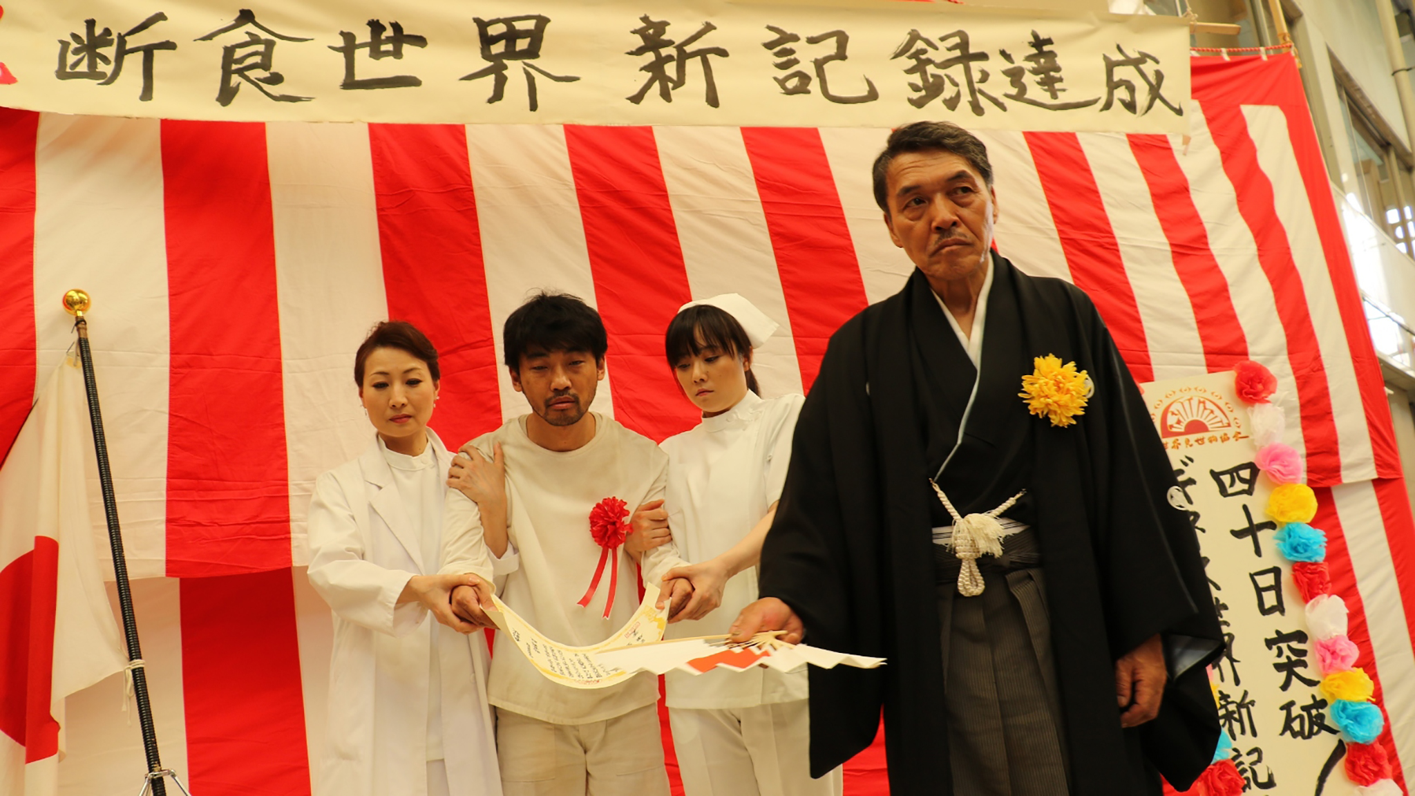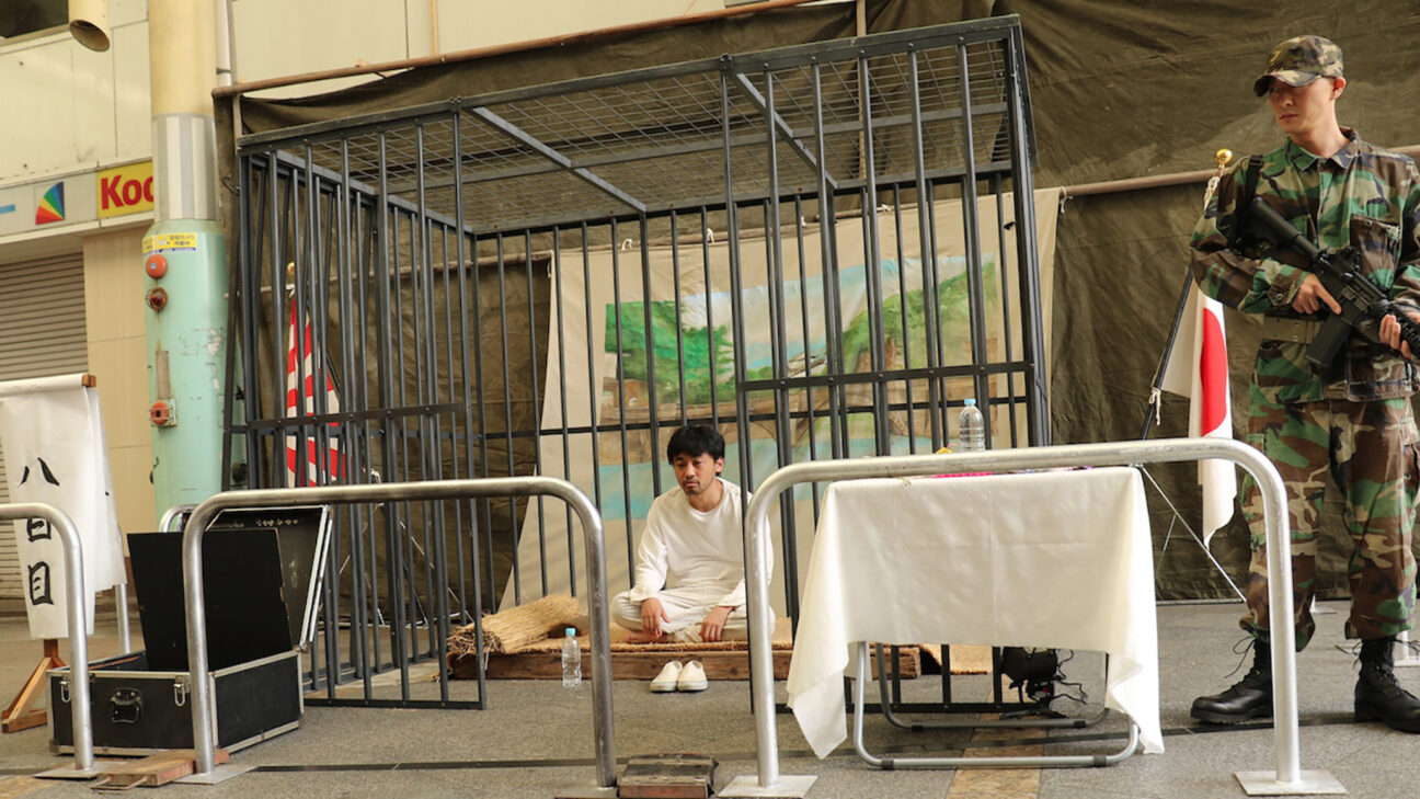 Adachi Masao returns with his latest feature that demonstrates he has lost none of his political edge. Inspired by Franz Kafka’s short story A Hunger Artist, the satirical comedy follows a silent nameless man who stages what appears to be a hunger strike in an outdoor shopping district in Utsunomiya city, Tochigi prefecture. The unexplained act of individual non-action as action creates confusion and deliberation in the community, and soon the lip-sealed protagonist finds himself becoming a media sensation and surrounded by an entourage of eccentrics – ranging from yakuzas to the Doctors for Borders – who claim to speak on his behalf. As noise musician Otomo Yoshihide’s unusually upbeat soundtrack skips along, the sex-tinted comedy finds Adachi taking a bite into a range of controversial topics from ISIS to the historical discrimination of the aboriginal Ainu people from northern Japan. Harking back to performance art of the 1960s in which he took part, the shooting of the film was in itself a performative intervention as Adachi and his team shot primarily at one inner city location over a period of a month. A cutting indictment of contemporary Japan, the absurdist theatre staged by Adachi questions the callous abuse of the individual by the state as well as the inability of onlookers to lend a hand to the defenceless.