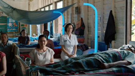 Beyond the hypnotizing hum of fans in the sultry Thai heat and the calming appearance of dreamy apparitions and ghosts, Weerasethakul’s films have always had a political dimension. After the military coup of 2014, here it inevitably pushes more to the foreground. The setting is an old school in Weerasethakul’s hometown, where an improvised hospital has been set up for soldiers suffering from a mysterious sleeping disorder. The elderly volunteer Jen cherishes one of these young men as the son she never had and a medium reads their dreams. Two goddesses appear in the guise of young women and tell that underneath the hospital lies an age-old cemetery, where rulers of old fight out a pre-historic battle and rob the sleeping young men of their life force. Told in Weerasathakul’s gentle and calmly subversive style, these notes from the underground, besides attesting to his deep love of the culture he grew up in, also represent a fierce indictment of the authoritarian regime. Also see the installation Fireworks (Archives).