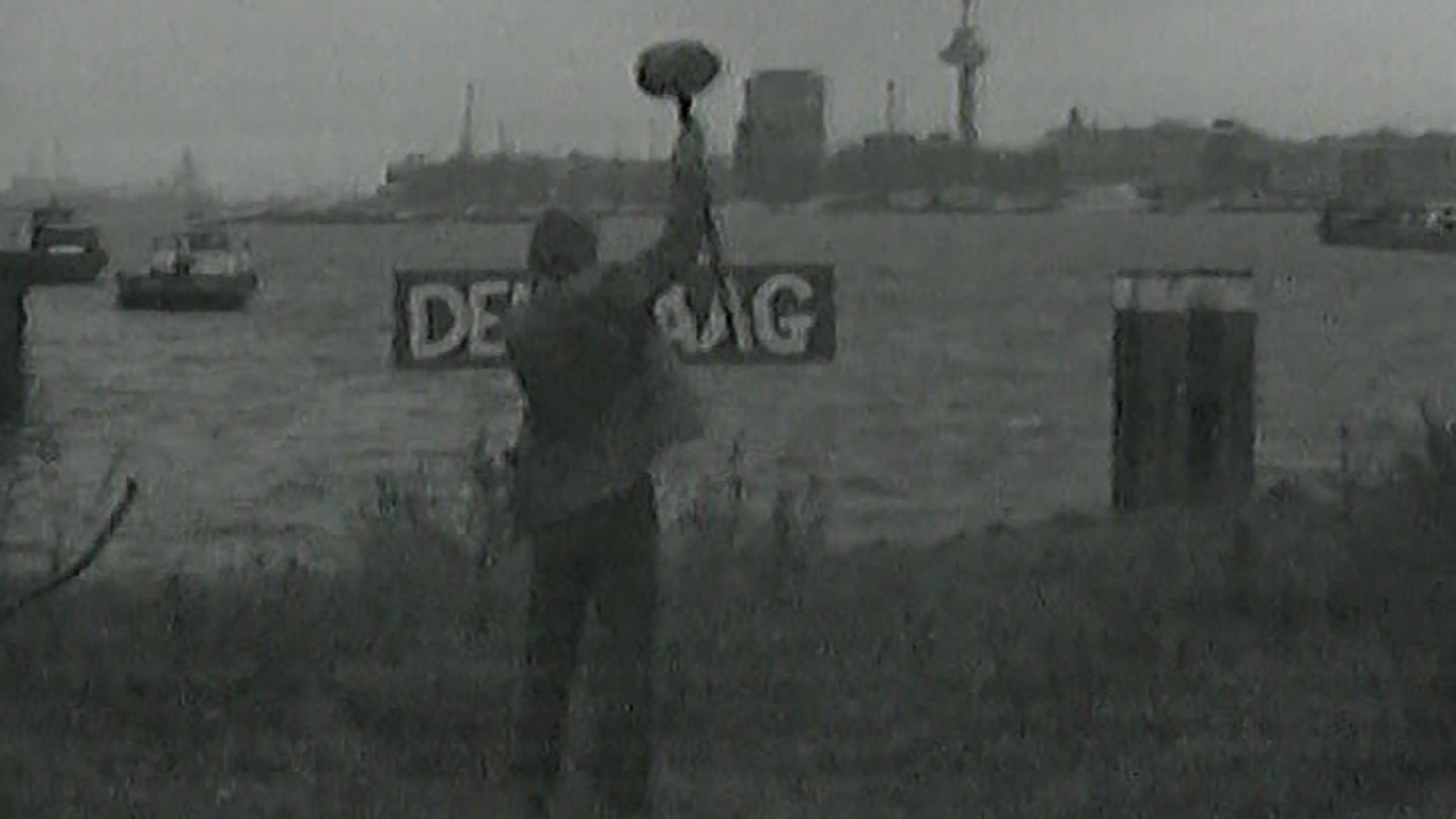 On the banks of the River Meuse, Wim Gijzen puts up a town sign. ‘The Hague’ in no way corresponds to the surroundings as the Euromast (observation tower in Rotterdam) can be seen in the distance. What happens when you swap two cities’ names? Gijzen studies spaces and their names in this black-and-white film.