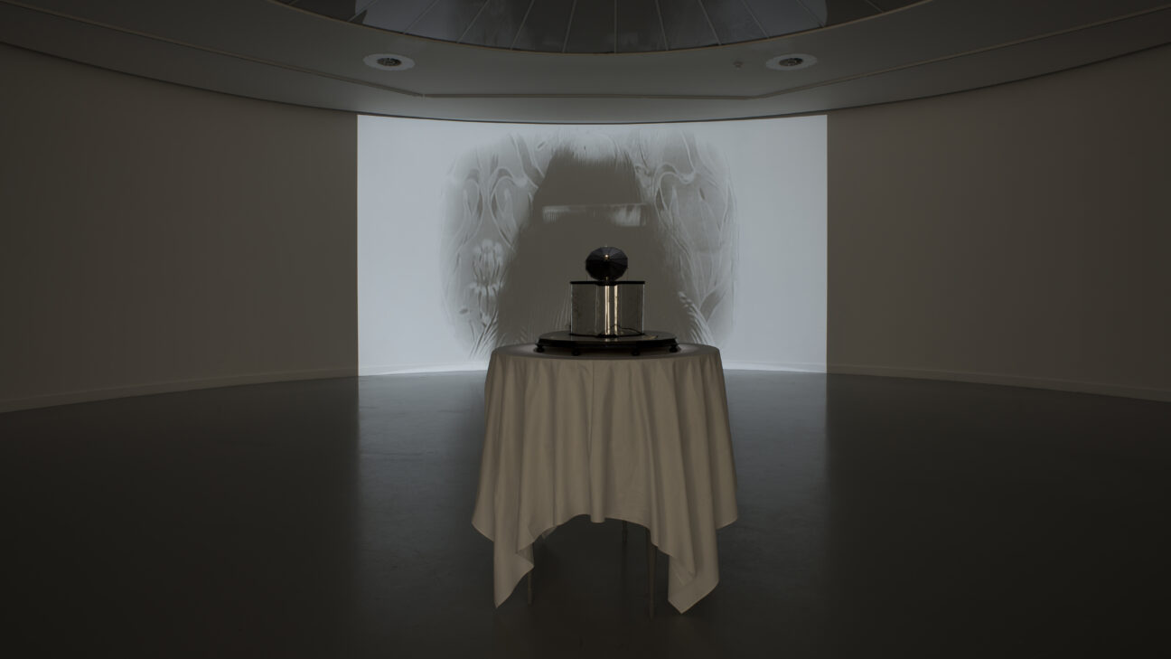 The “complicity” of the viewer is the most important recurring motif in the Quay Brothers’ artistic strategies. The oeuvre of this exceptional duo is a combination of graphic designs, stop-motion animation films, decors for opera and dance, and spatial installations. The twins constructed an octagonal scale-model with little mirrors, inspired by de Chomón’s animated short film, The Electric Hotel (1908). An additional looped projection serves as an intertextual anchor. One element, more particularly a strand of hair from the film scene, makes a return in the scale-model’s design. Our gaze is directed by means of an anamorphic mirror, by the delineation of the space around the object and by the reflections of larger mirrors hanging at regular intervals in the room, turning it into a life-size zoetrope. The viewer thus becomes a component of the optical scheme.