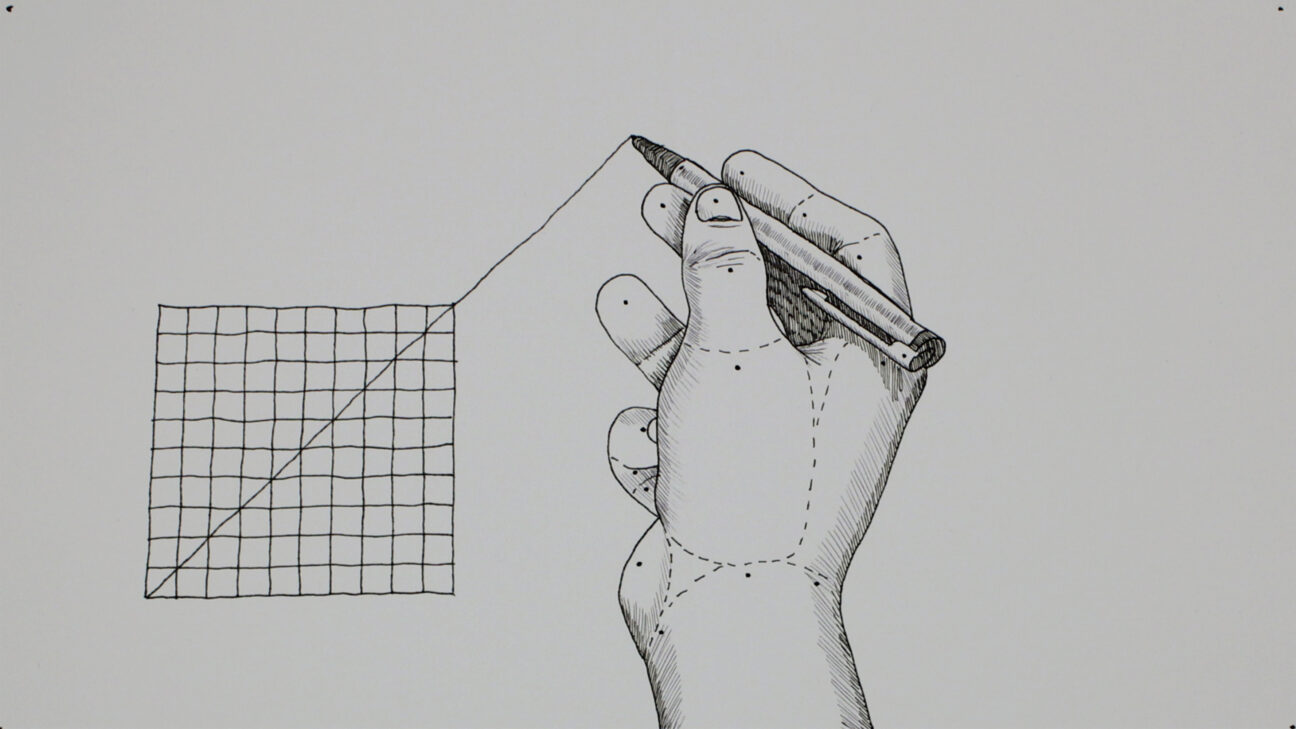 In this hand-drawn animation, a line is being extrapolated through a grid. After exceeding the boundaries of the grid, the process spreads to its -