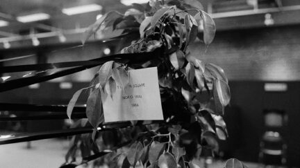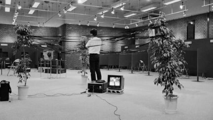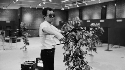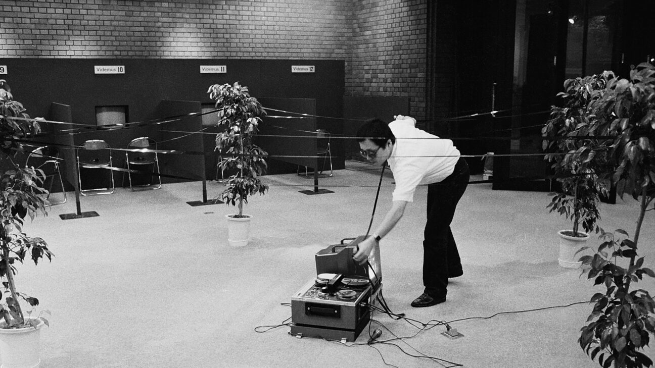Four plant pots provide the corners around which Imai Norio wraps open-reel videotape to form a square shape, juxtaposing contrasting embodiments of time. Live playback simultaneously presents his actions on a monitor, adding further layers to the experience of time as image.
