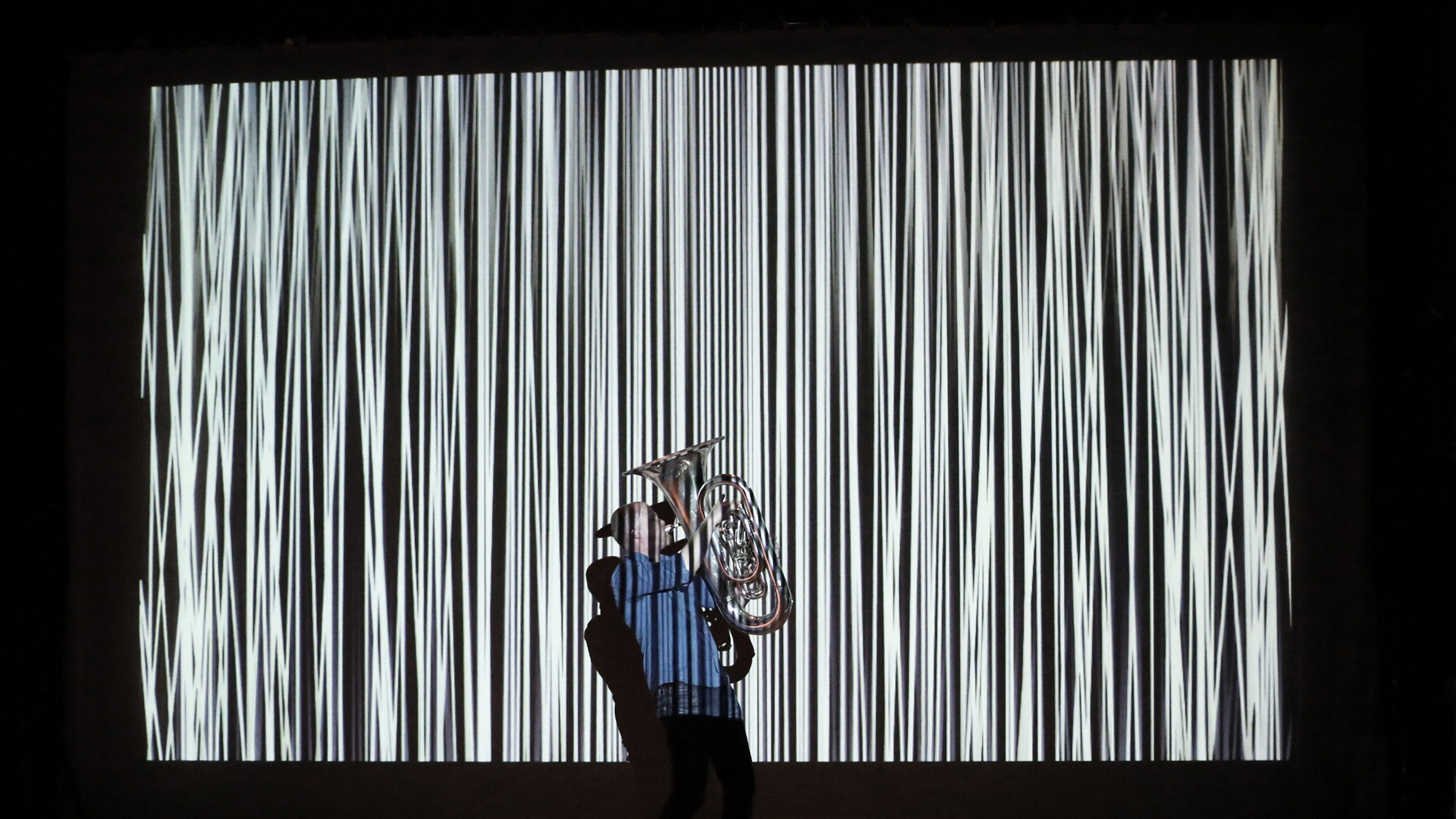 As night falls, we join a Flemish company: Klaas Verpoest (visuals), collaborating with Peter Jacquemyn (double bass), Jan Pillaert (bass tuba) and Vincent Caers (live electronics). In the improvised WORP#2 they play a game with feedback, dissolving the contours of instruments, musicians and material.