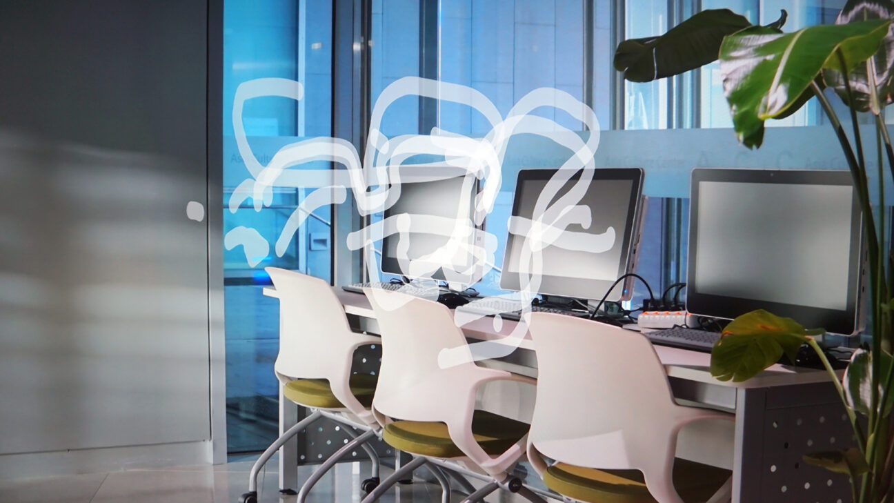 Mysterious white sculptural forms are on display in an empty office environment. Digital graphic tools further enhance the visual alienation. -