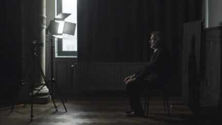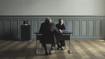 Sitting at a table in an empty room, a man listens to an interrogation tape. It relates
