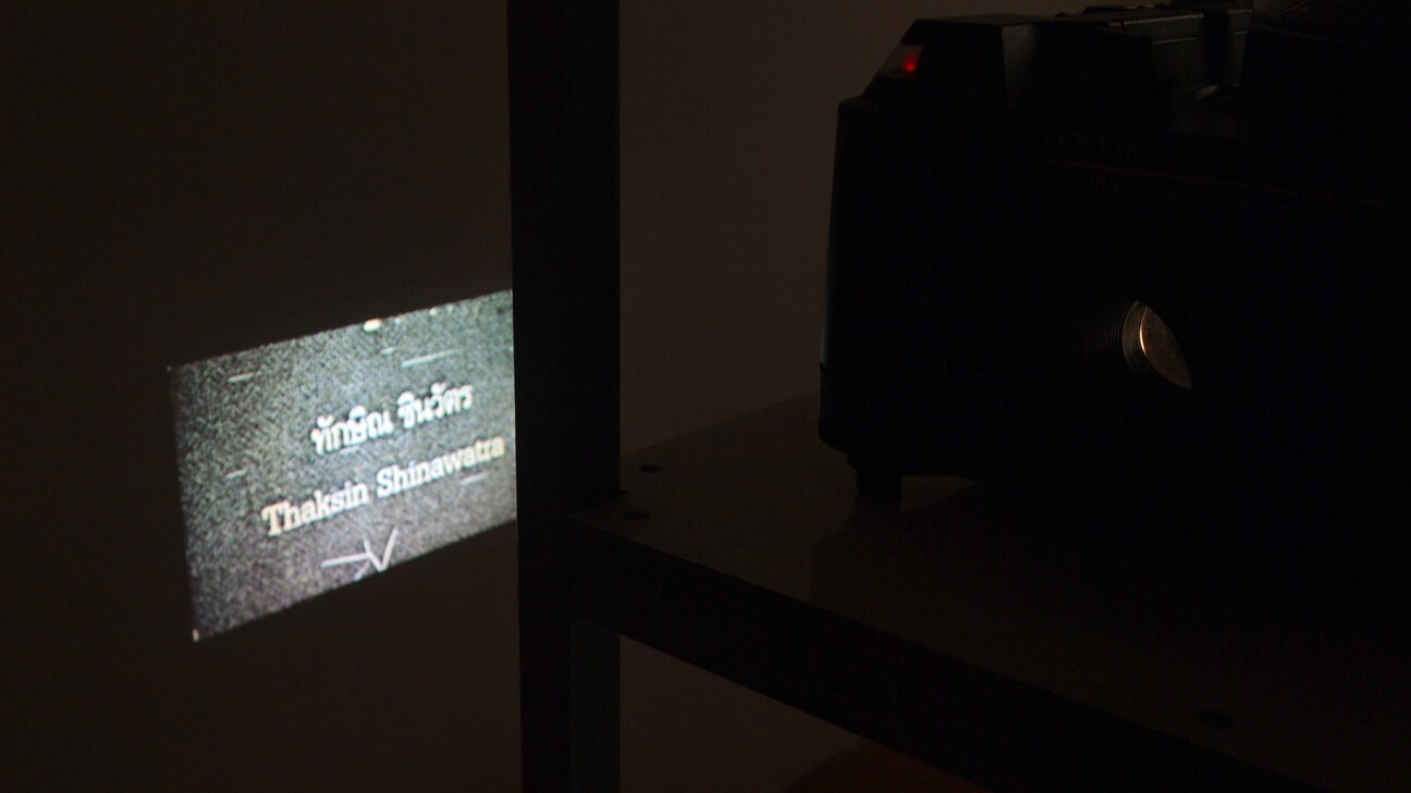 Non-chronological History is an installation with multiple slide projectors, each slide presenting names associated with Thai political events since 1932. As its title suggests, the names are reshuffled out of chronological order to emphasise the interconnections of history and to speculate how one’s (in)actions may have had unexpected ripple effects.