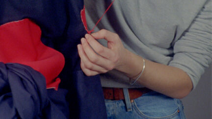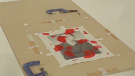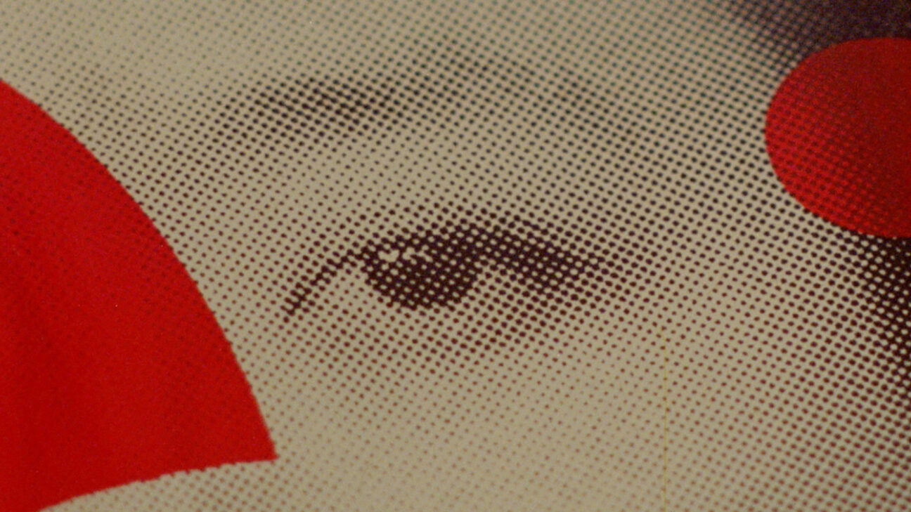 Mysterious collage meticulously observes a woman producing a screen print of herself. A second red layer contaminates the image. This then doubles when the pattern is also applied to her clothing. A miniature on reality and reproduction with melancholy audio collage.