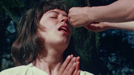 In a vast underground cave, Schneemann and seven nude women read a text as each woman slowly extracts a scroll from her vagina. -