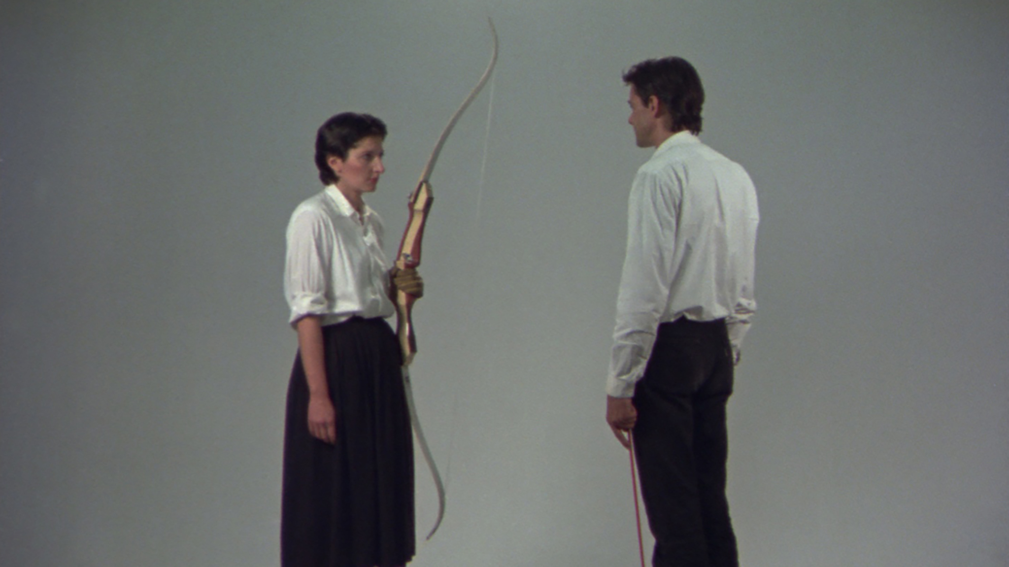 Ulay and Abramovic draw a large bow and arrow, one holding each side. The arrowhead is pointing at Abramovic’s heart. The slightest movement could be fatal. Microphones on their clothes pick up their quickening heart beats and Ulay’s irregular breathing. (LIMA)