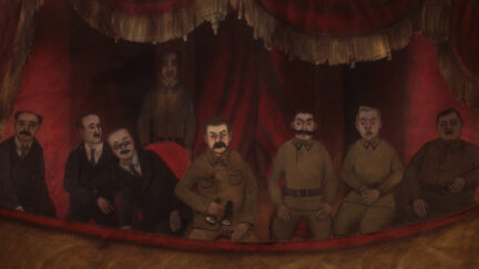 Could that really be: Marlen Khutsiev’s 1960s banned milestone llych’s Gate screening as in-flight entertainment?! Mark the moment one gets to see Andrei Tarkovsky being slapped for sardonically wondering about the praise-worthiness of turnips. A moment to remember in this gorgeous potpourri that combines animation and opera to chronicle the Russian 20th century. On the plane, classics of Soviet cinema unspool on the monitors, while two gentlemen discuss Gogol’s proto-surrealist 1836 novella The Nose and what it means to be civilized today.