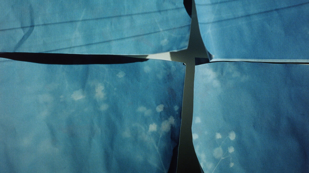 Quiet film on super-sharp 35mm melds filigree gypsophilia flowers, the filmmaker’s father’s old love letters and cyanotypes she was given by her lover into an intimate structure. Inspired by Terayama Shuji’s Shadow Film: A Woman with Two Heads from 1977.